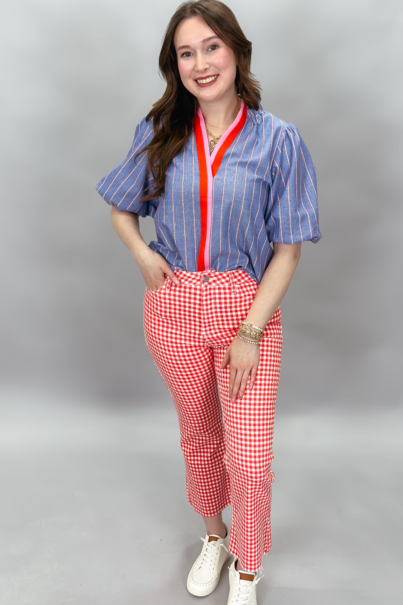 High Rise Crop Flare Jeans, Red Gingham
