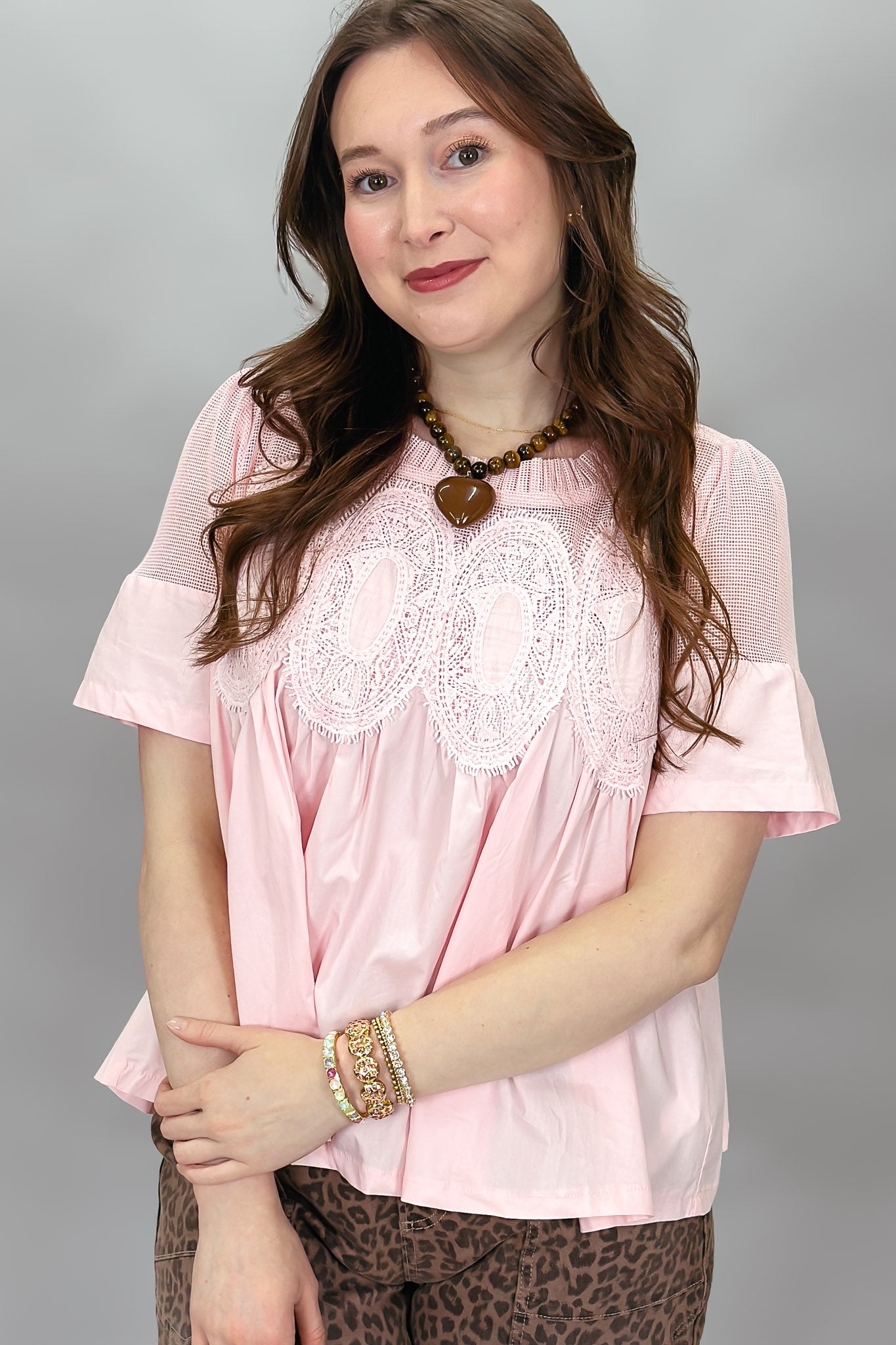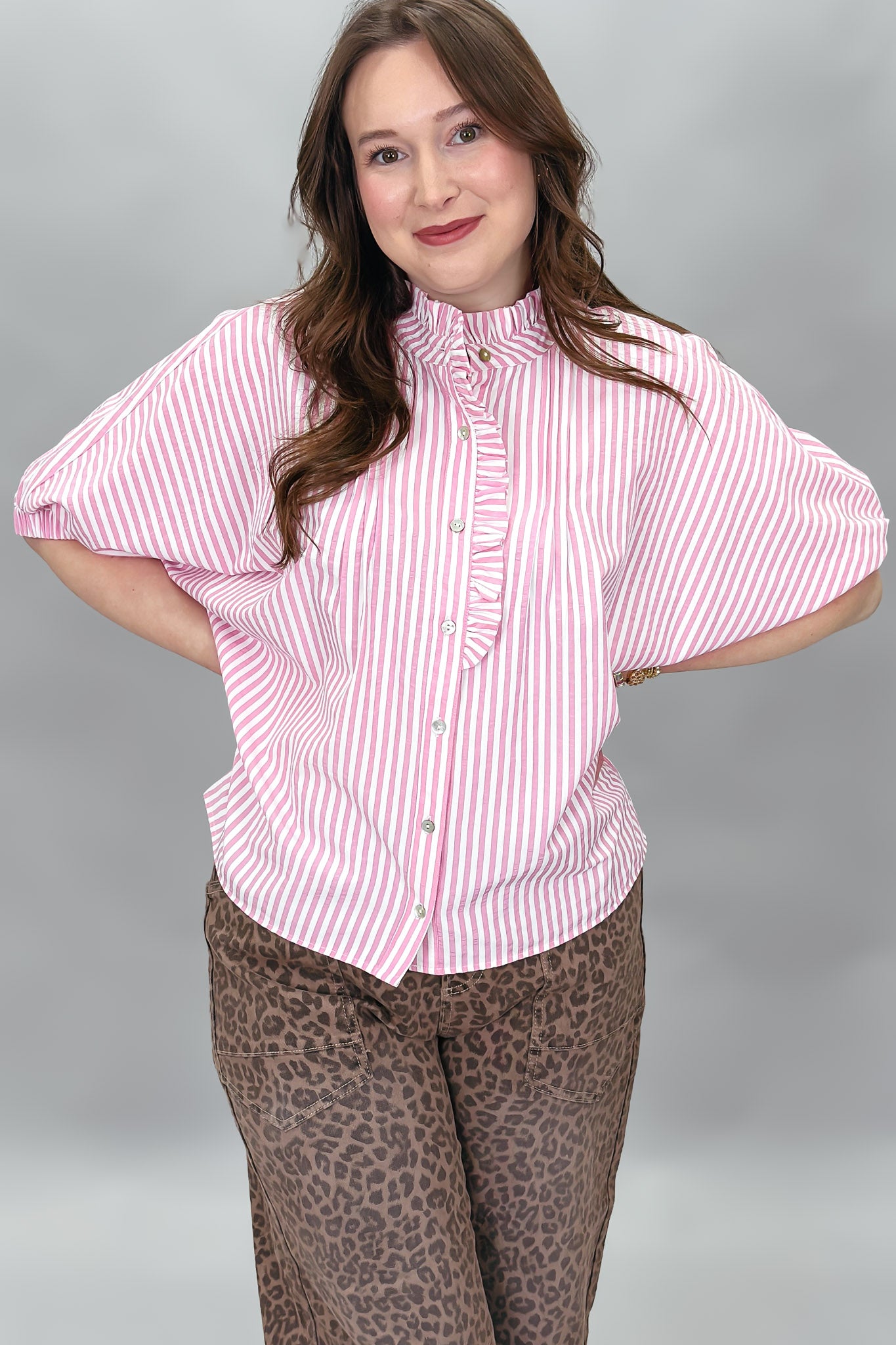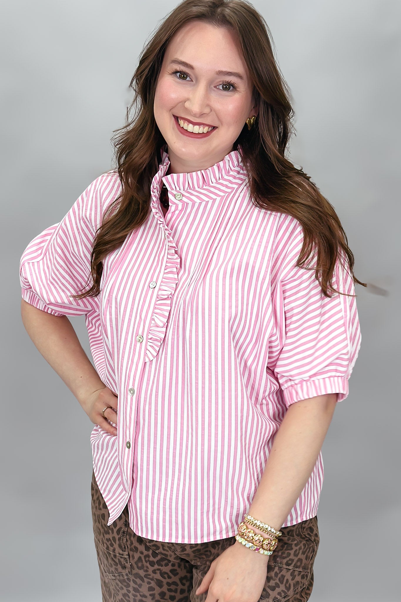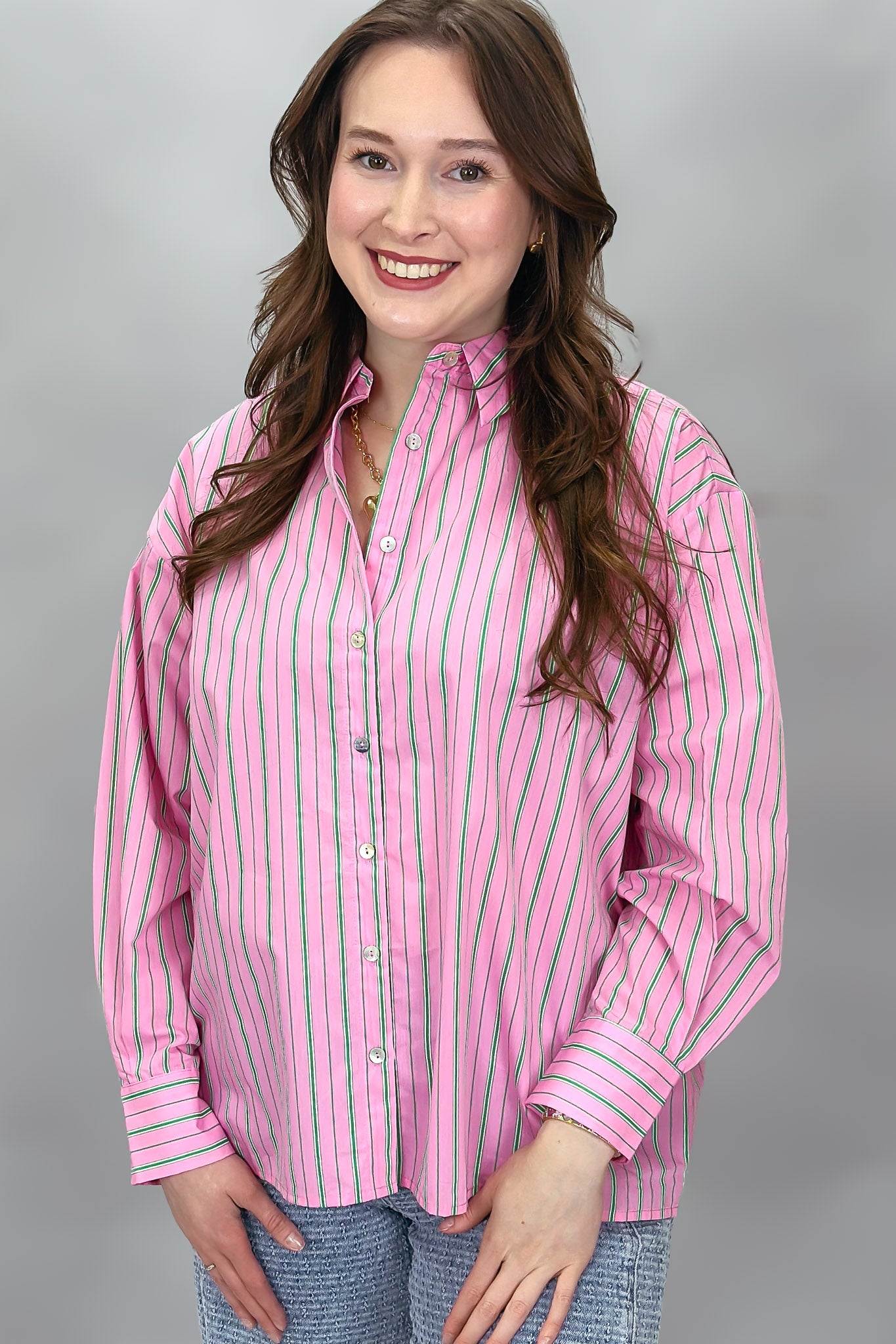 Crazy Girl Striped Button-up Collared Top, Pink