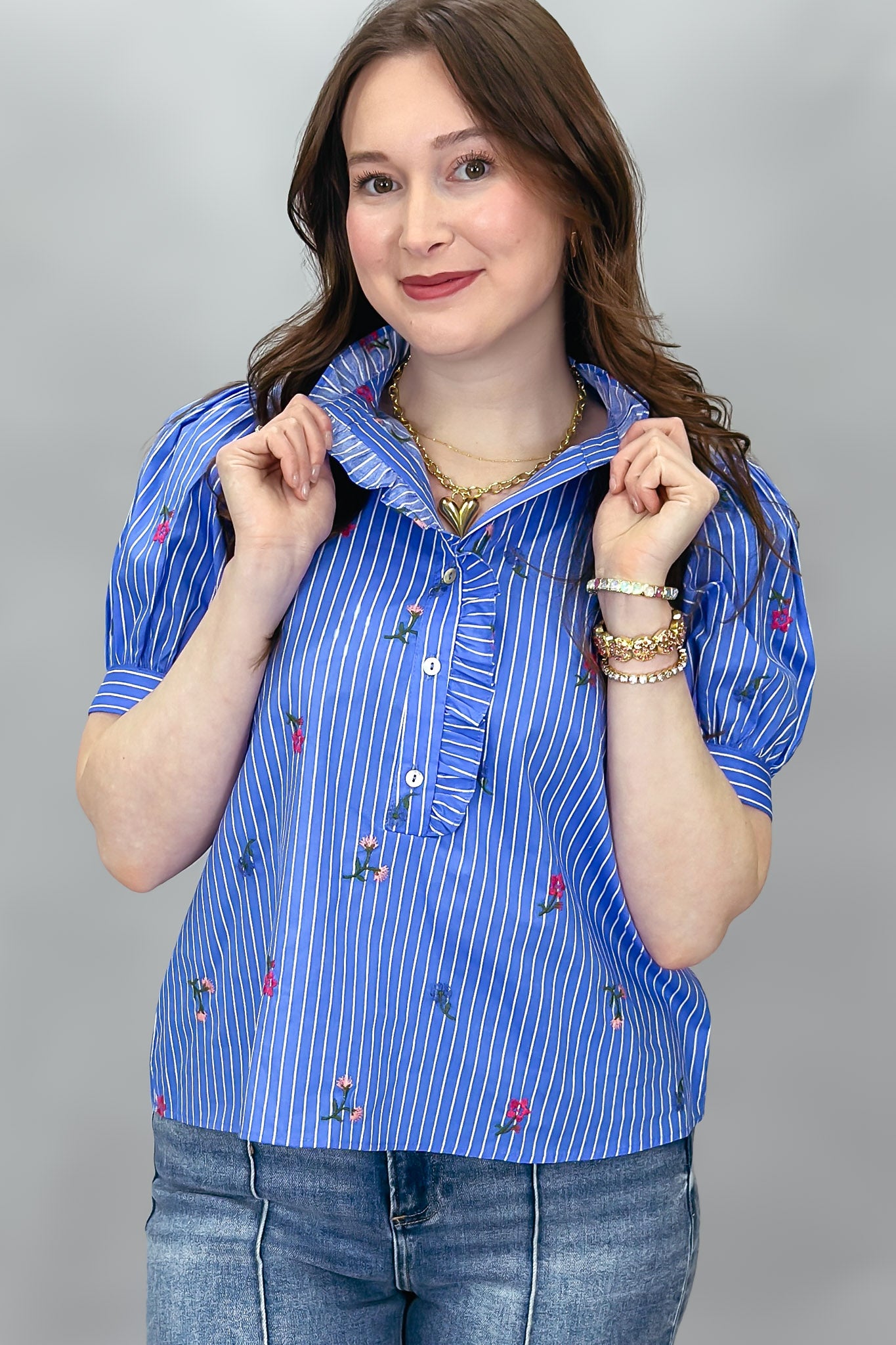 Seeing Blind Button-up Pearl Embellish Top, Blue