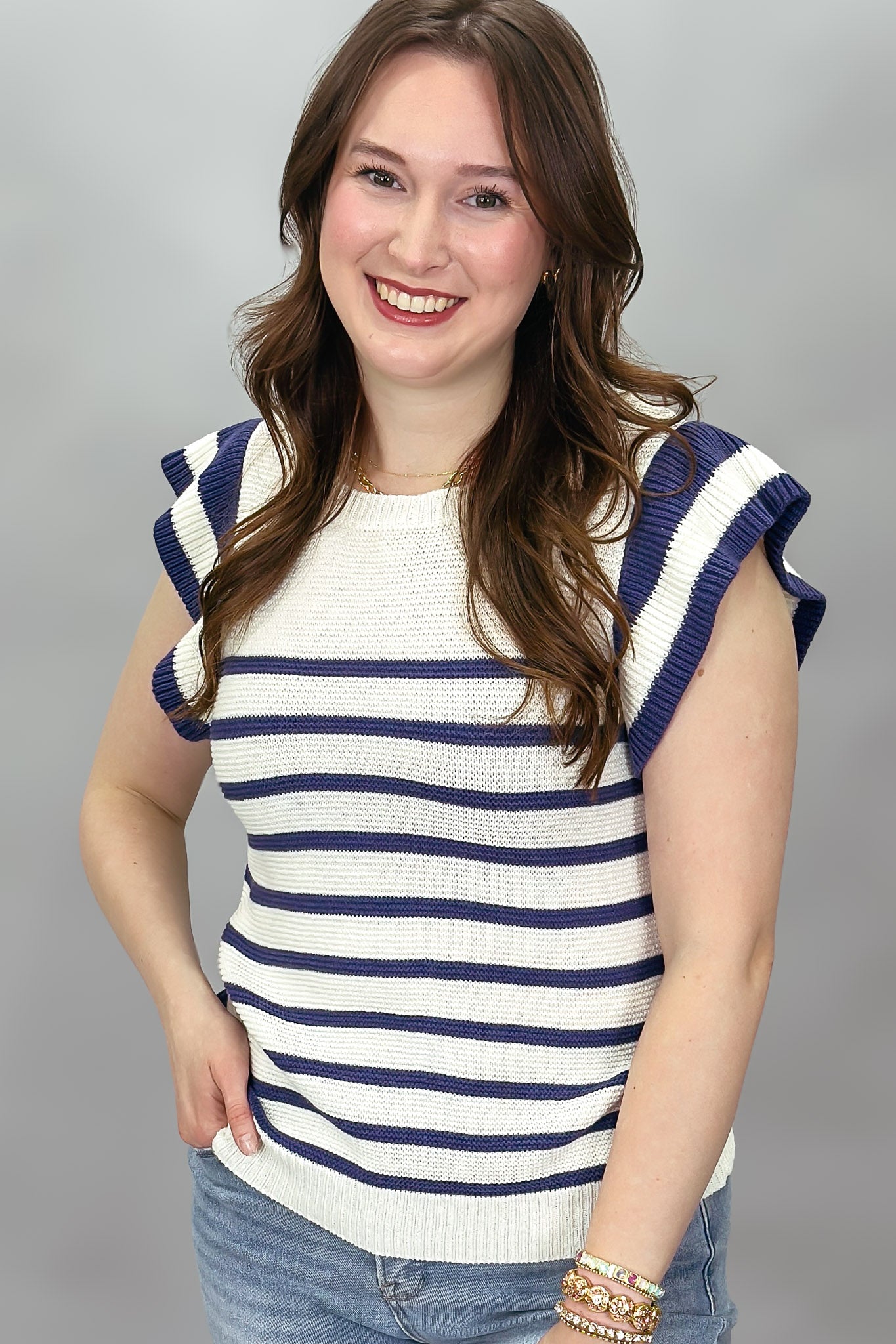 Someday Stripe Ruffle Neck Top, Blue