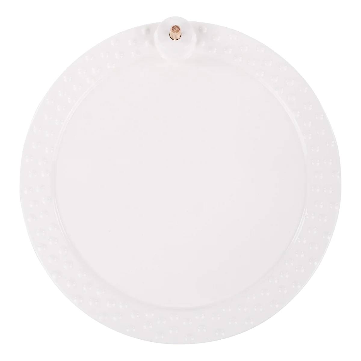 Make a statement at your next gathering with our white round platter, featuring ornamental toppers (sold separately). Great for holidays, Special Events, Tailgates, & more! Simply attach one of our optional toppers to the wooden peg included with your platter to add seasonal charm and unique personality!