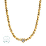 The necklace features a beautiful array of delicate gold-plated beads that form a chic collar, designed to sit elegantly on your neckline. The centerpiece is a dazzling heart-shaped cubic zirconia (CZ) accent pendant, meticulously cut to mimic the brilliant sparkle of a genuine diamond. This faux diamond heart perfectly blends classic charm with contemporary allure, making it a true showstopper.
