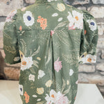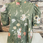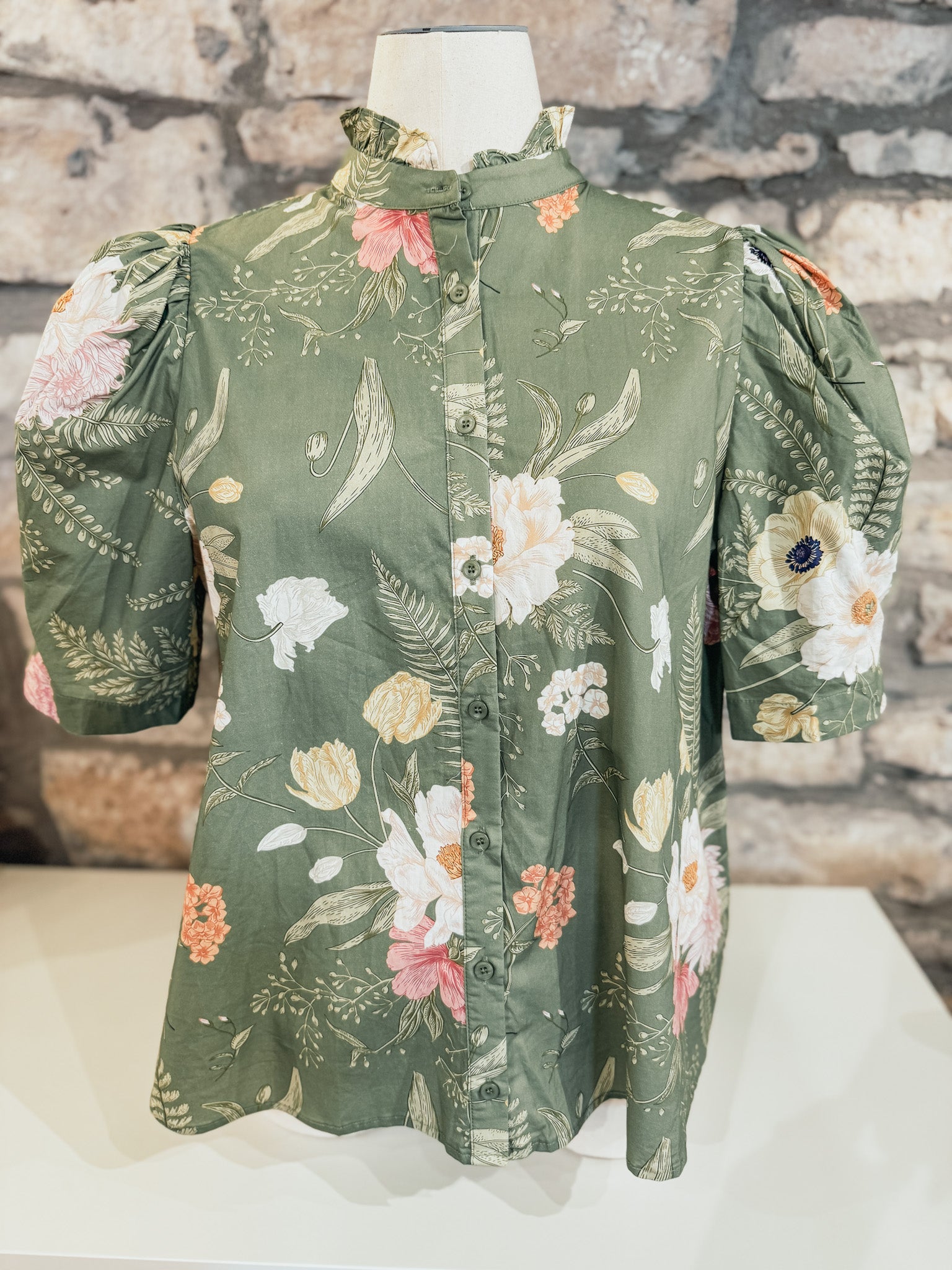 This top is a fall wardrobe dream. The soft olive green backdrop is covered in a mix of delicate florals that pop in shades of blush, cream, and golden yellow. The ruffled stand collar and button-front closure give it a polished finish, while the short puff sleeves with subtle pleats add a feminine touch. Made from 100% breathable cotton, it’s lightweight and perfect for layering under jackets or cardigans.