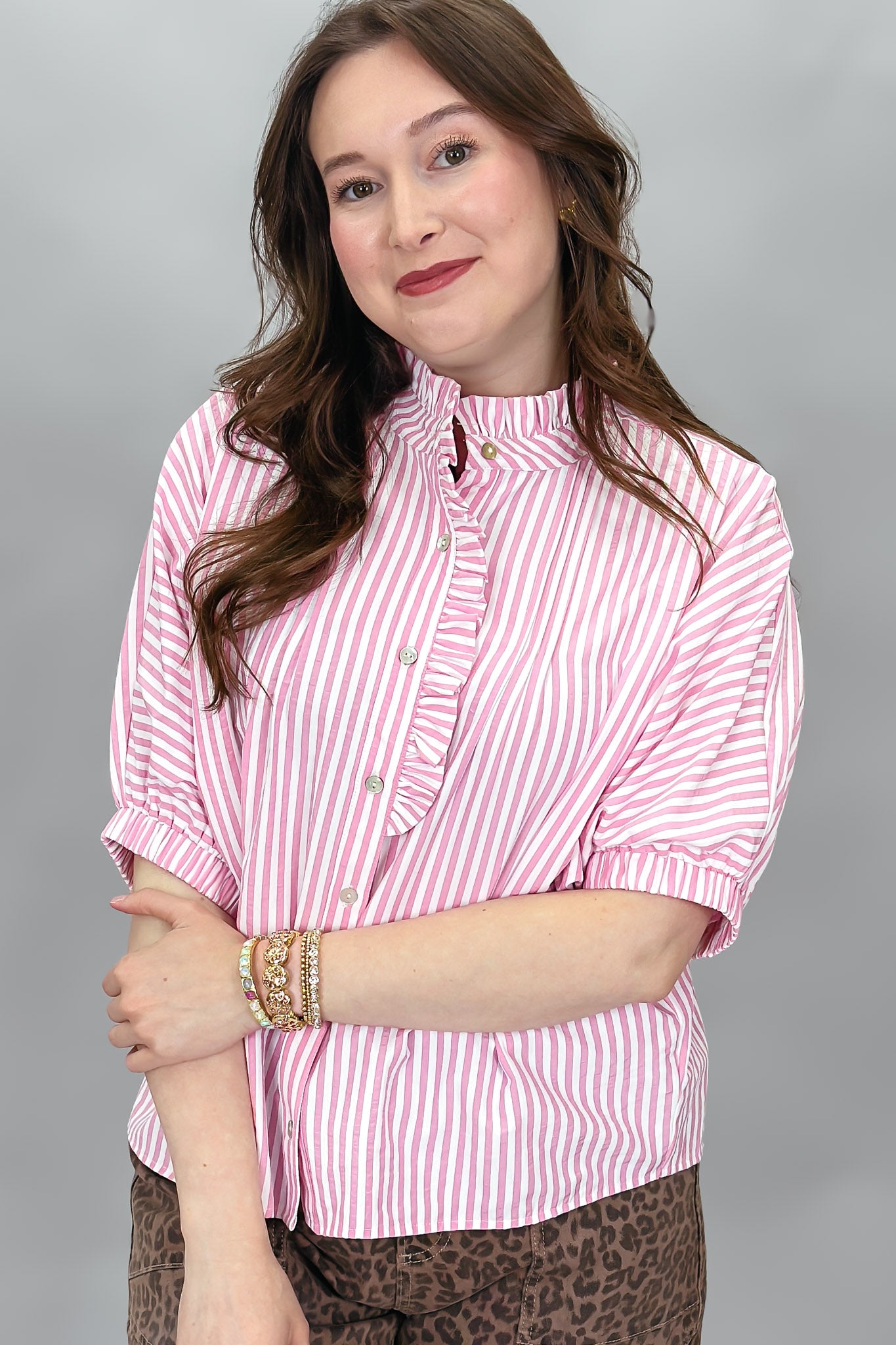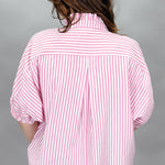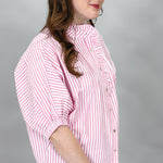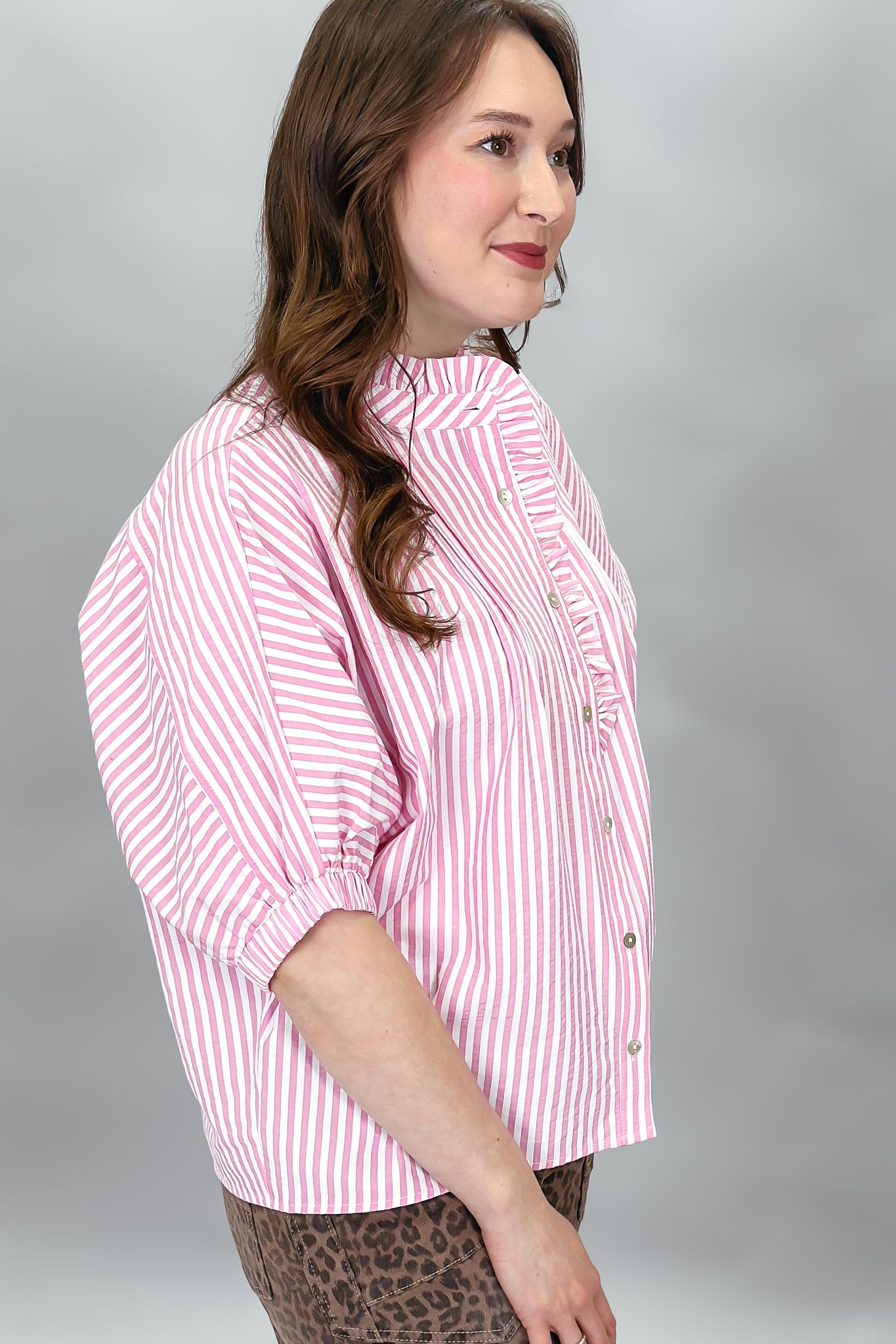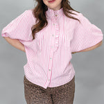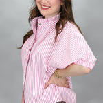 Pink striped dolman sleeve top with ruffle trim and button front.