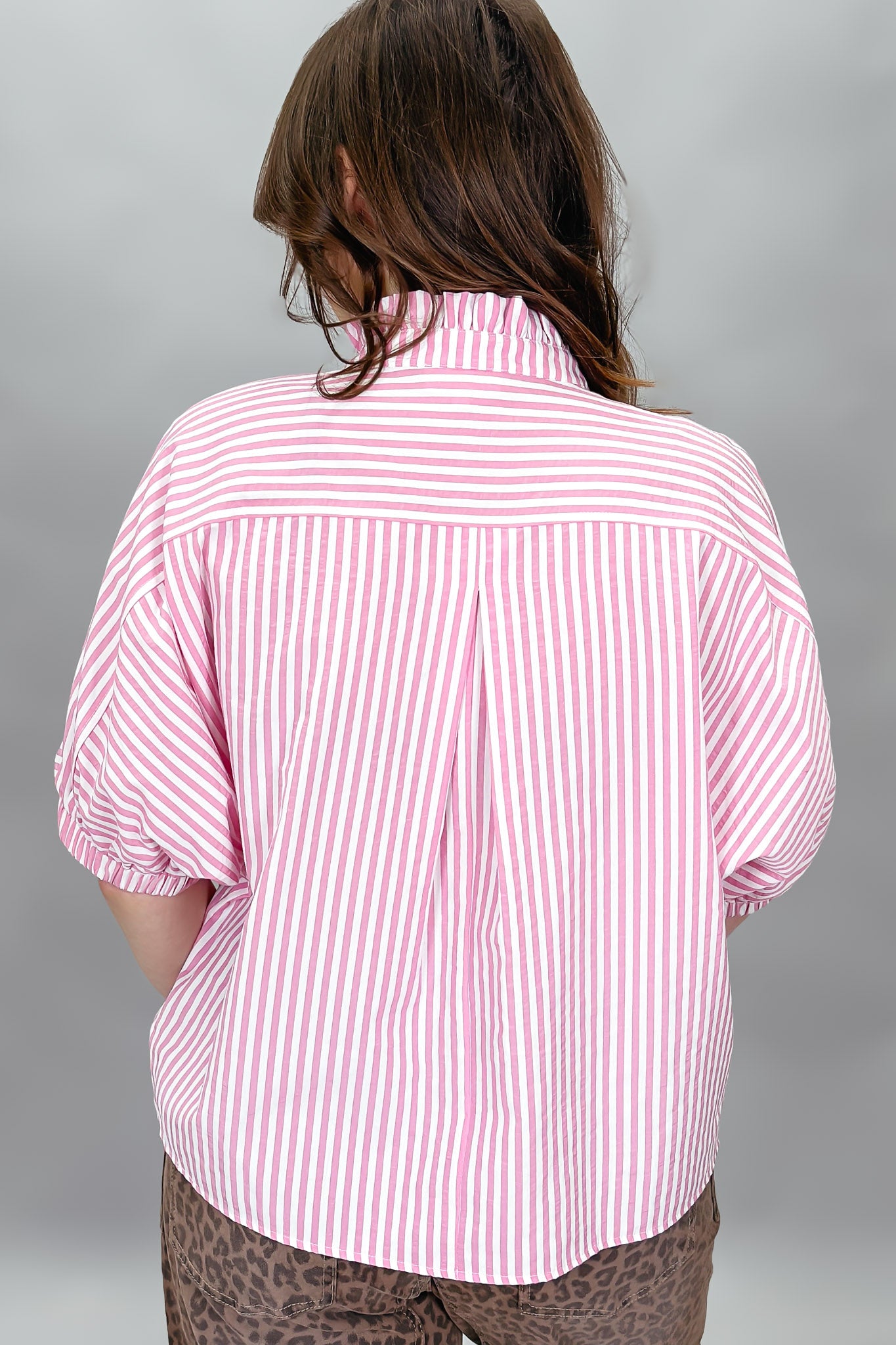 This pink striped blouse brings a fresh, feminine touch to everyday style. Designed with relaxed dolman sleeves, it features a classic stripe pattern paired with delicate ruffle trim along the button placket for a playful detail. The lightweight woven fabric keeps it comfortable and breathable, while the elastic sleeve cuffs add a soft, gathered shape. Easy to dress up or down, this top adds a polished feel to casual outfits.