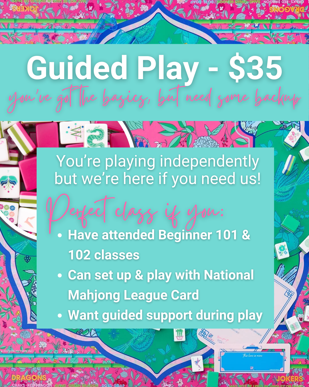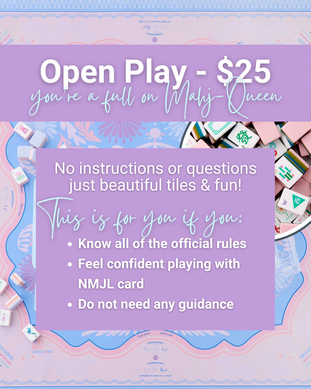 From Beginner 101 (first-timers) to Open Play (for confident players using the full National Mahjong League card), there's a seat for everyone at the table.