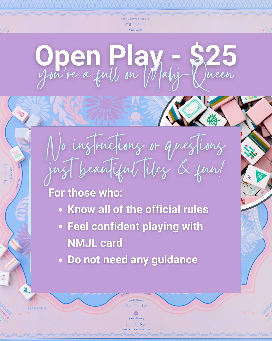 Whether you're learning to call your first "Mahjong!" or just here for the laughs and snacks—we promise you'll leave with new skills, new friends and a newfound obsession!