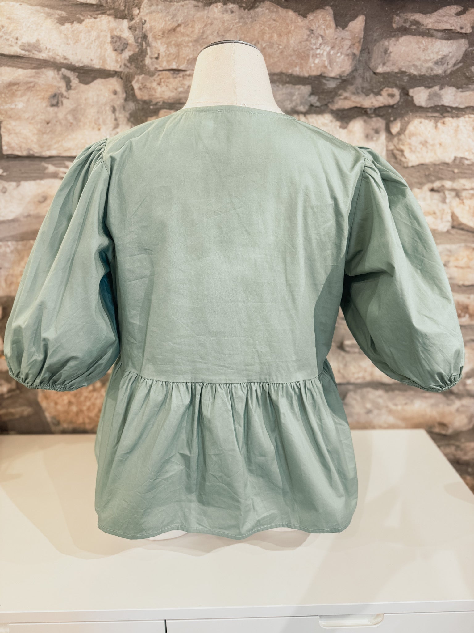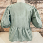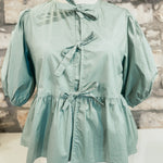 Easy, feminine, and a little bit playful — this peplum blouse is one you’ll reach for on repeat. The front-tie detail adds a sweet touch, and the puffed sleeves give it just enough volume to feel special. Available in two gorgeous colors — a soft sage green and a vibrant red — it’s the perfect piece to transition from casual daytime to dressy dinner plans.
