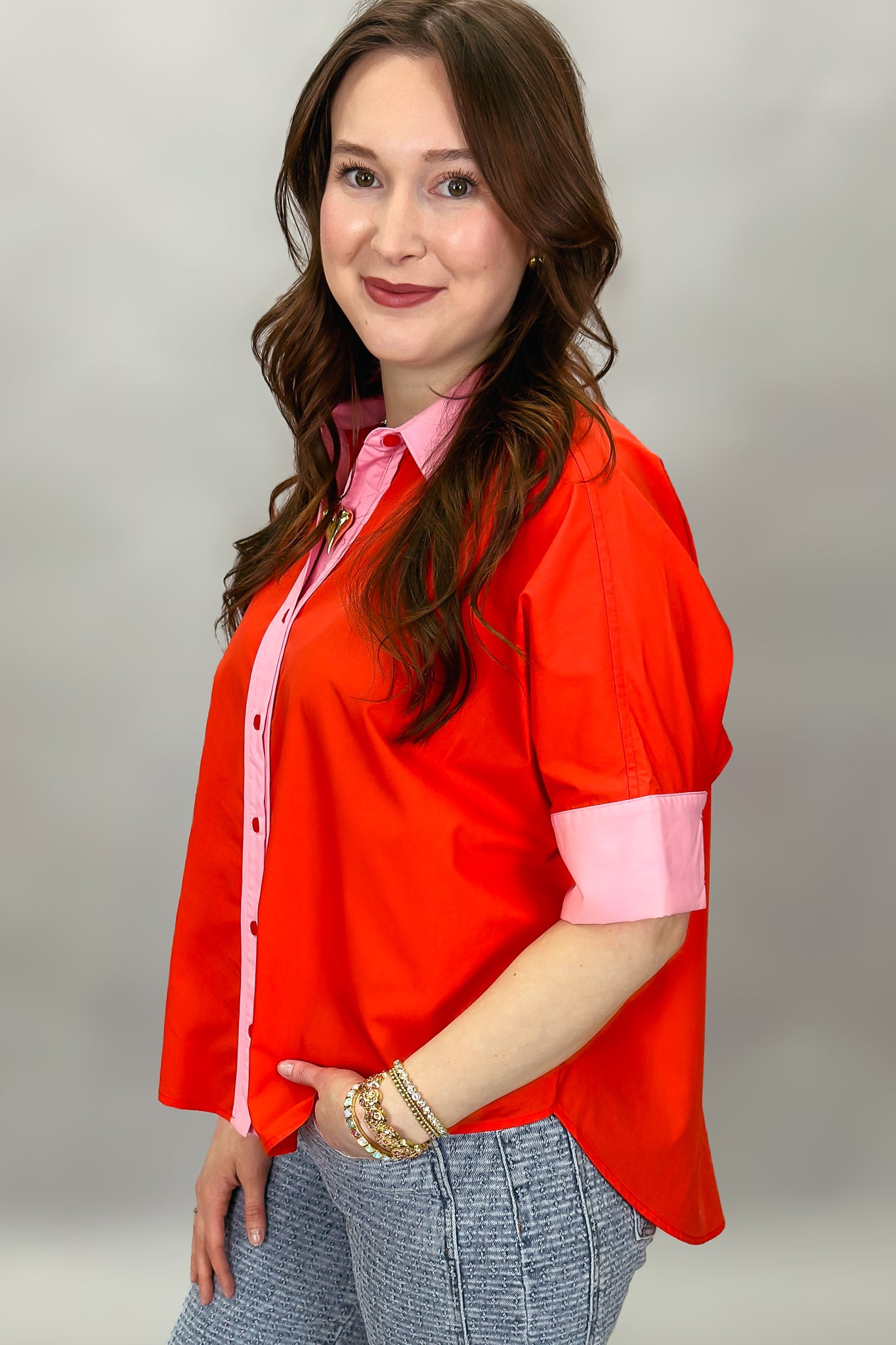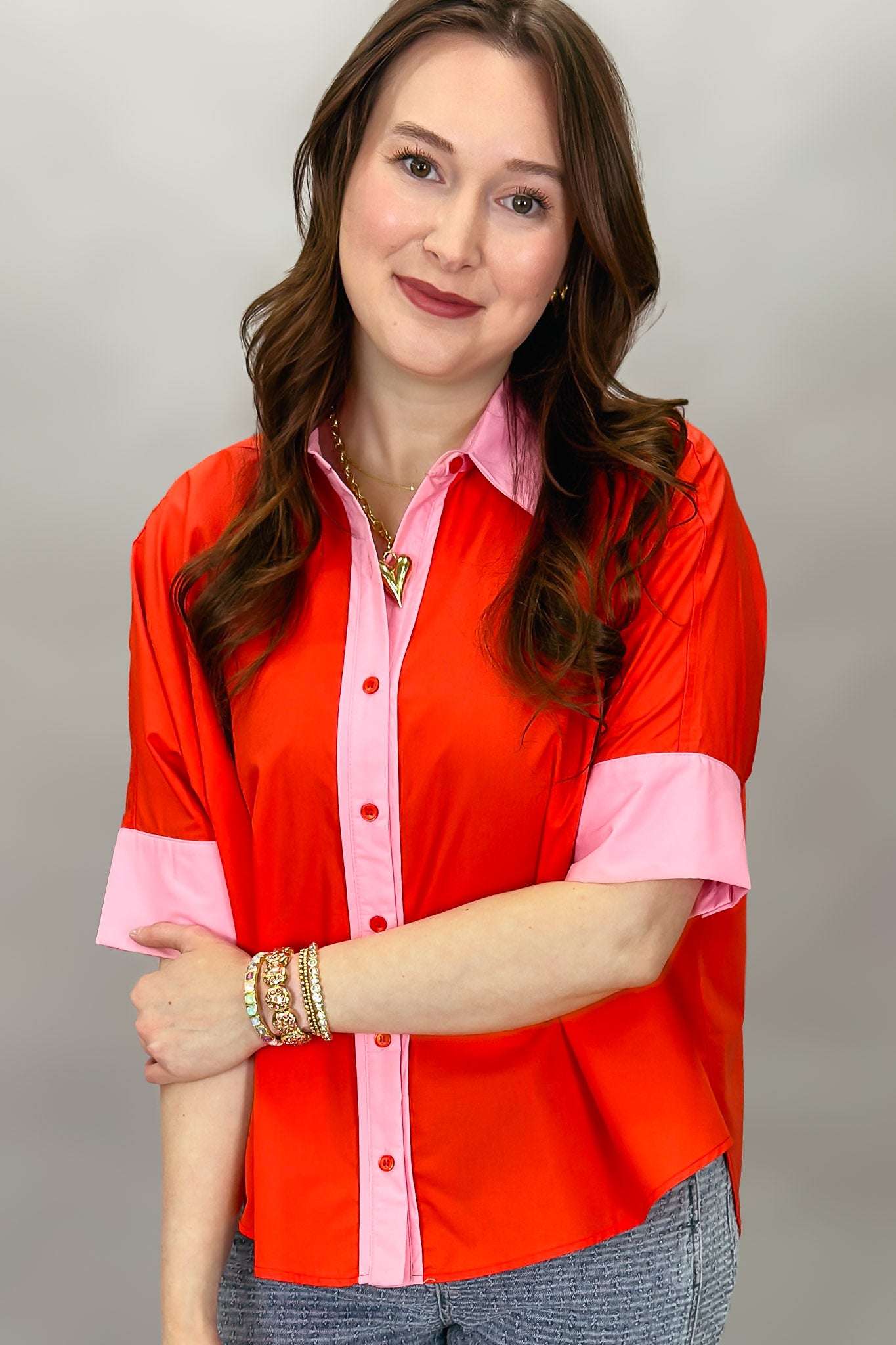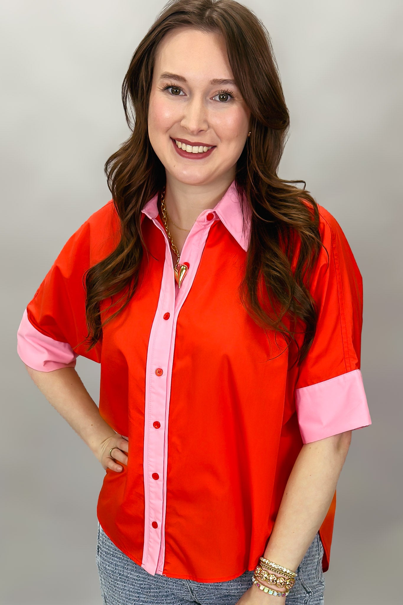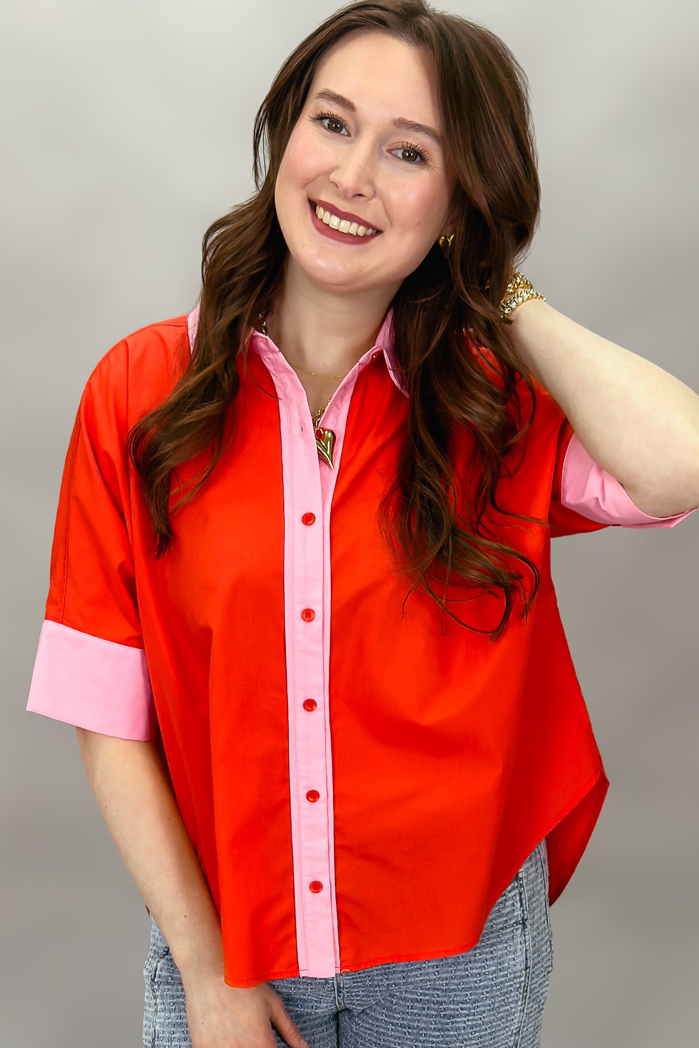 Bright red button-front blouse with pink contrast trim.