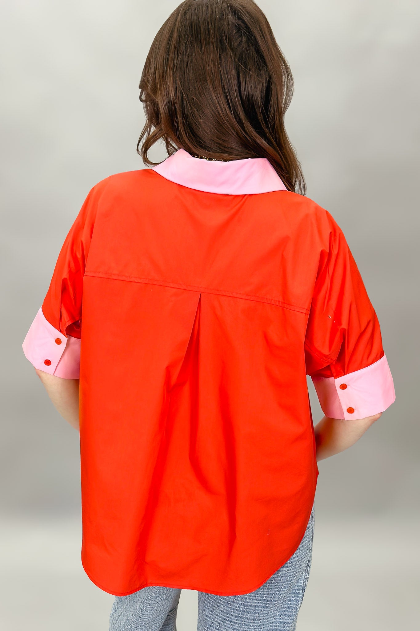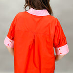 This vibrant red blouse is an instant mood-booster for your closet. Designed with a relaxed silhouette and crisp contrast pink trim, it features a classic pointed collar, button-front closure, and cuffed short sleeves for a polished yet playful look. The lightweight woven fabric keeps it breathable and comfortable, while the slightly longer back hem adds easy movement and coverage. It’s a statement piece that still feels effortless enough for everyday wear.