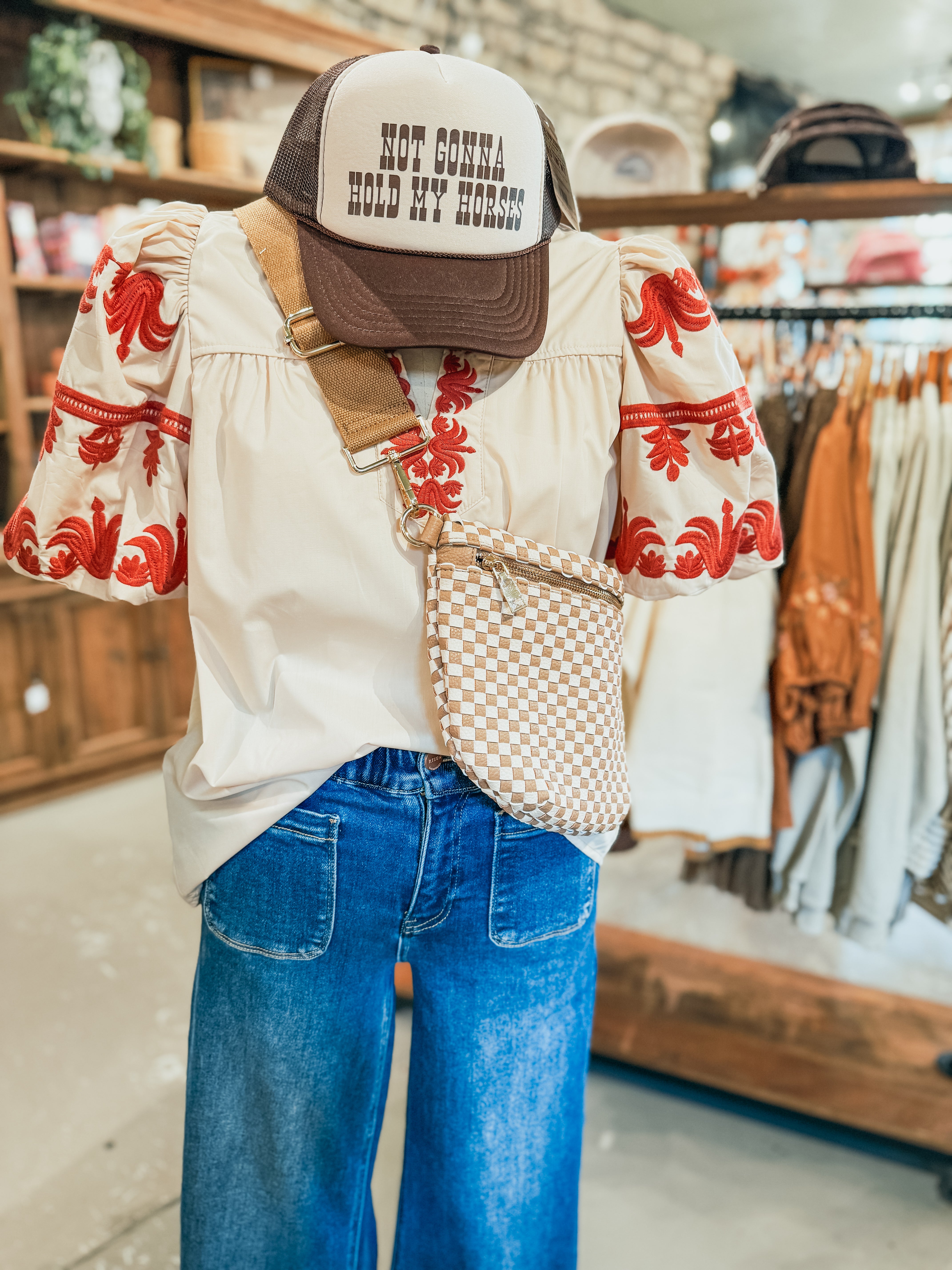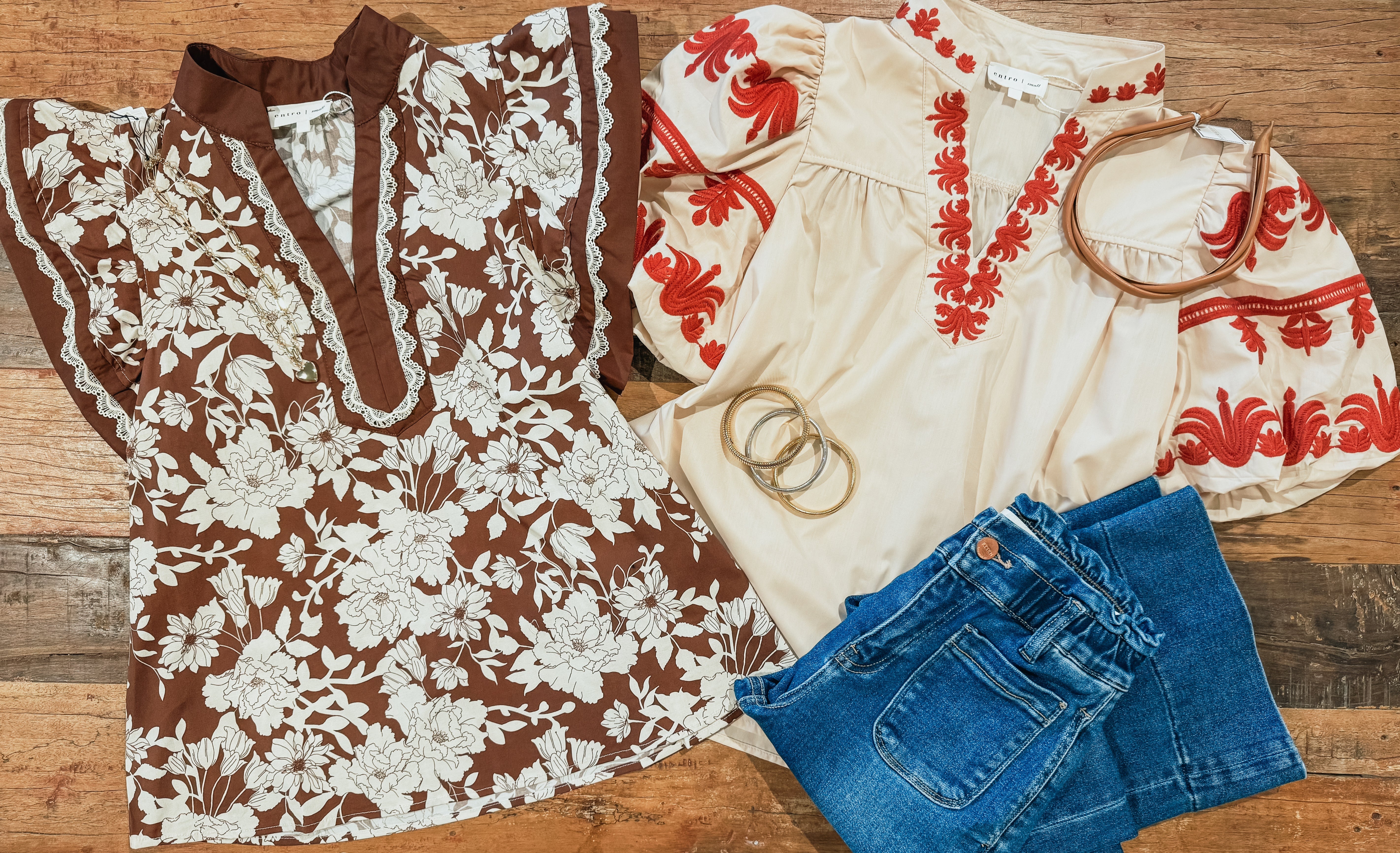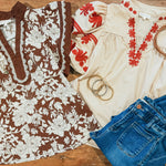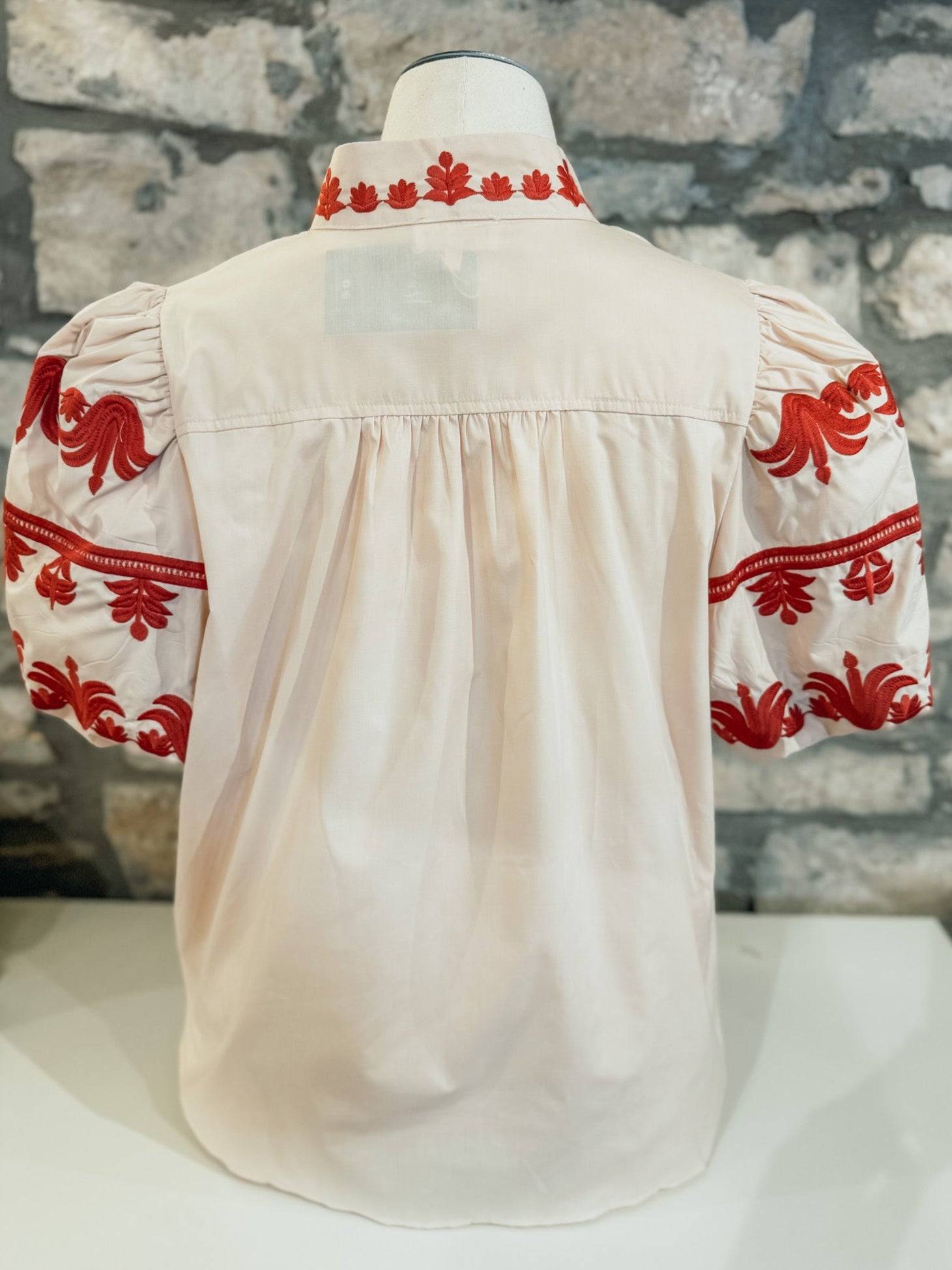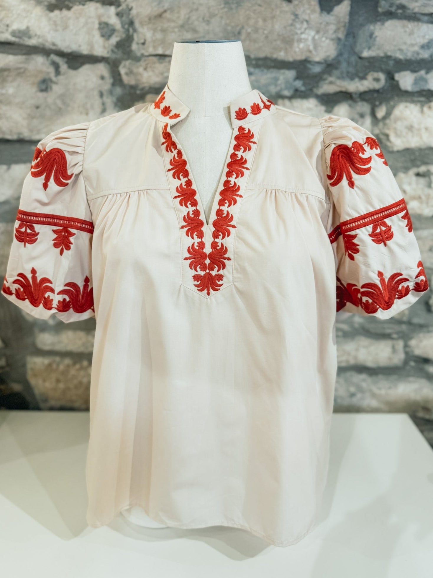 This top is a showstopper with its bold rust embroidery that pops against the soft neutral base. The band collar and V-neckline create a flattering frame for your face, while the short bubble sleeves give it just the right amount of volume. Lightweight and easy to wear, this is the perfect piece to take you from day to night with minimal effort.