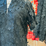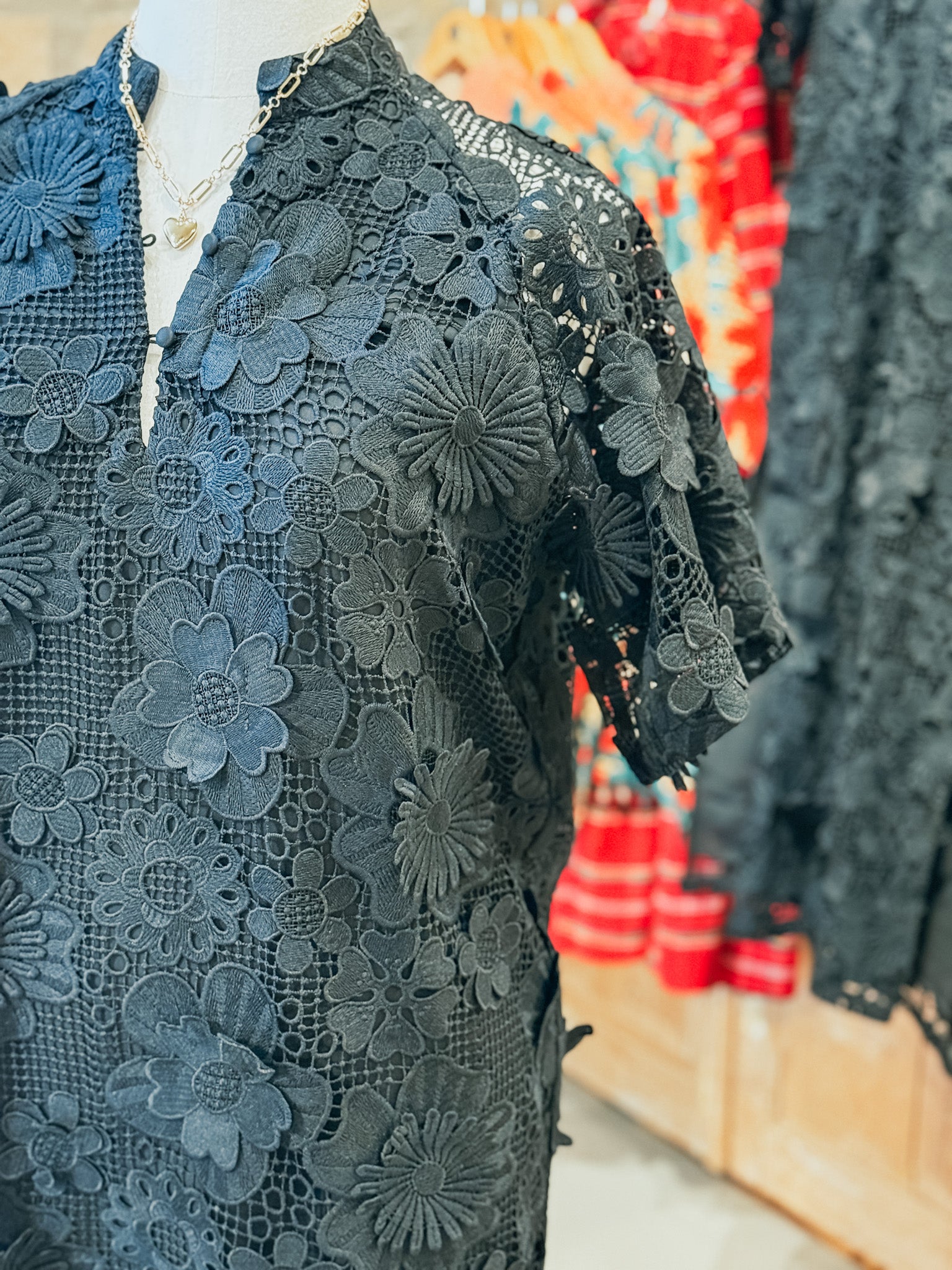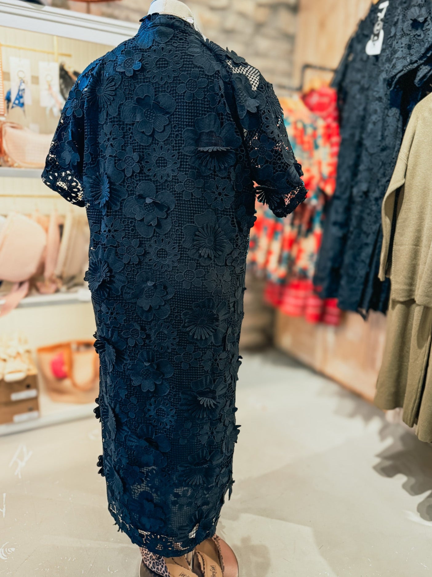 - Details: Floral lace overlay, two side slits, short sleeves, midi length