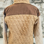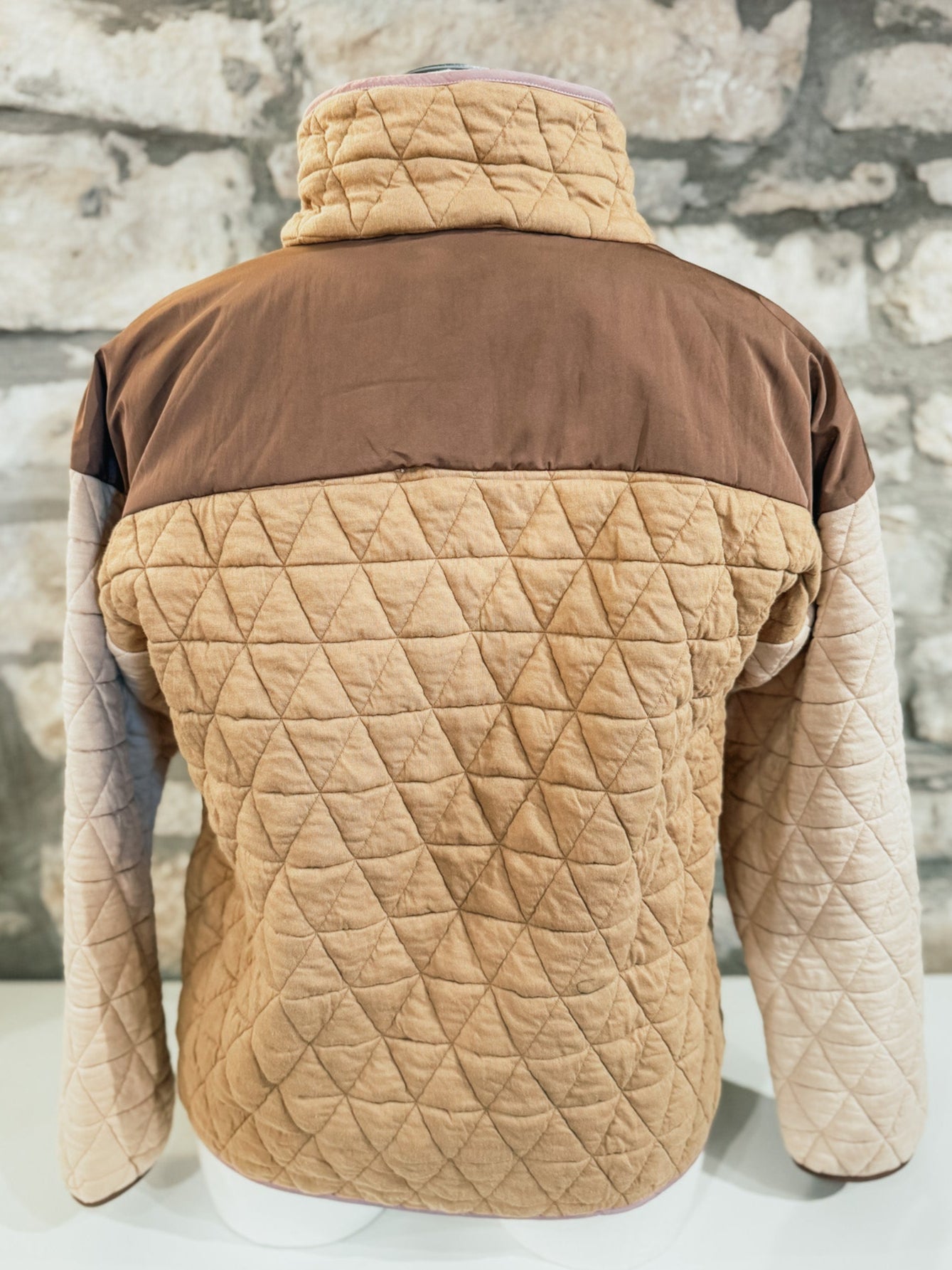 Cozy meets cute with this quilted pullover. The mocha-and-cream colorblock design feels fresh and modern, while the high button-up neck keeps you warm and stylish. The diamond quilted texture adds just the right amount of interest, and the relaxed fit makes it an easy throw-on-and-go piece for chilly mornings, errands, or casual weekend plans.