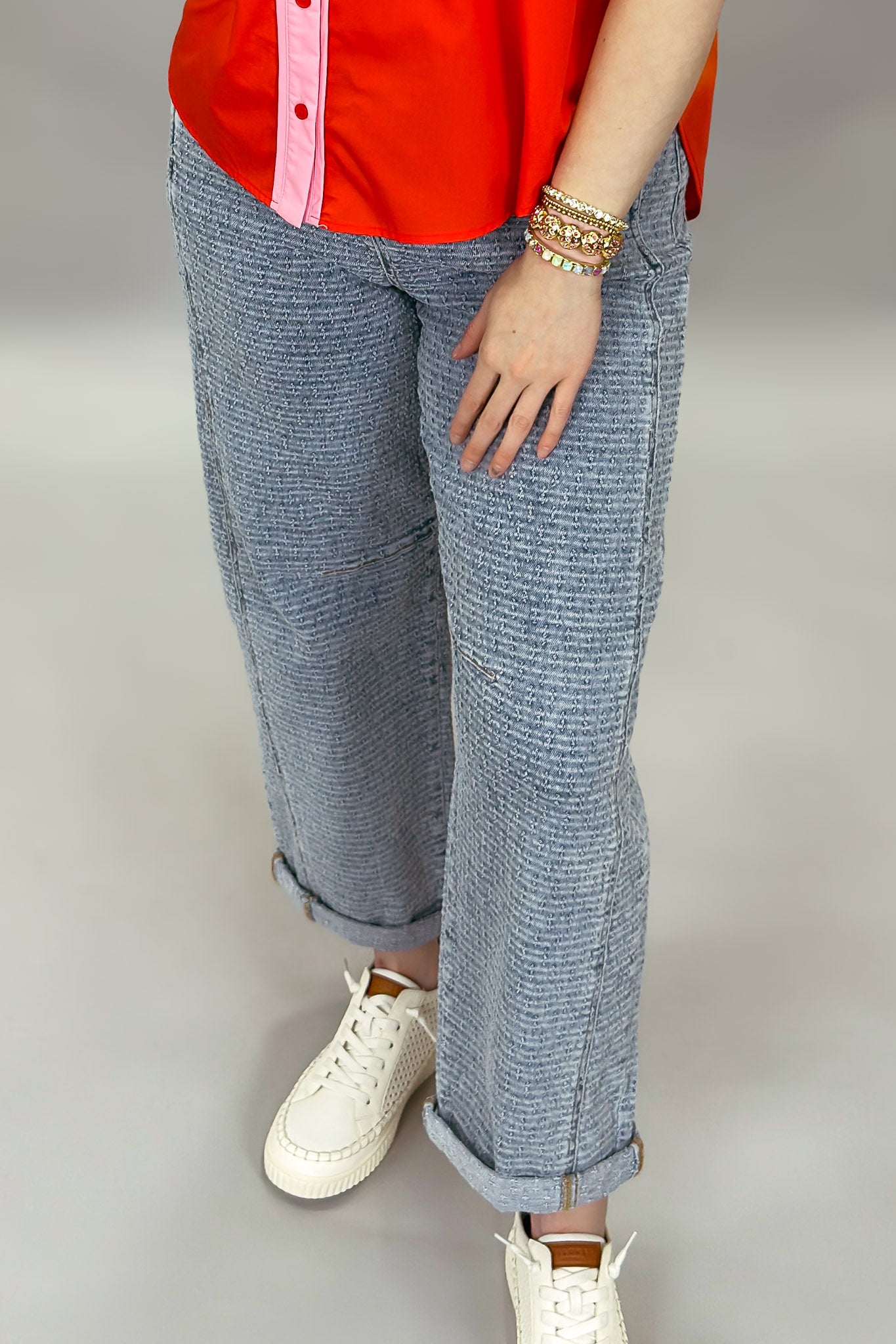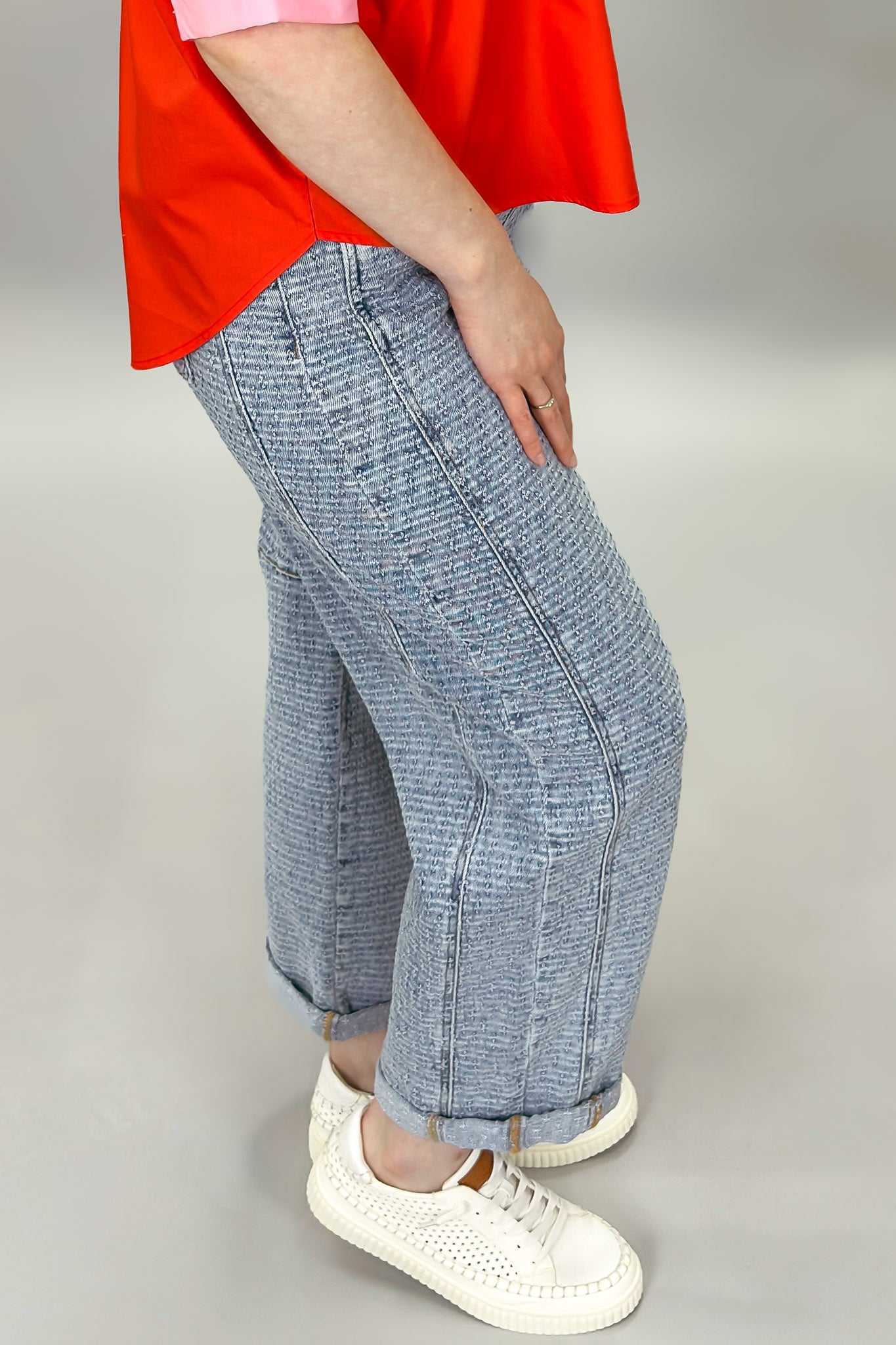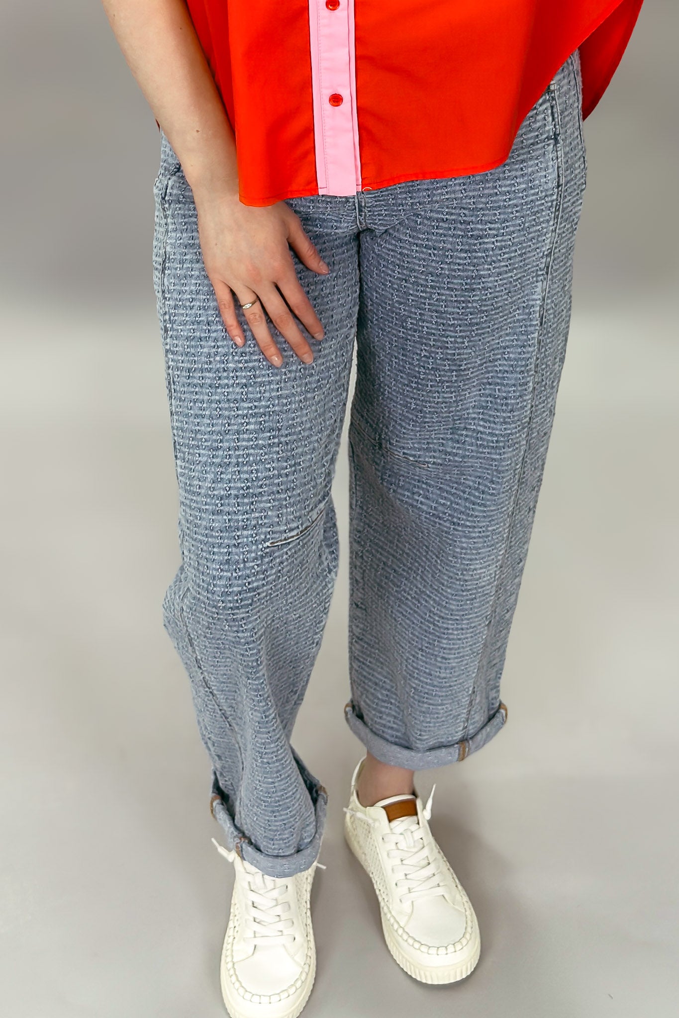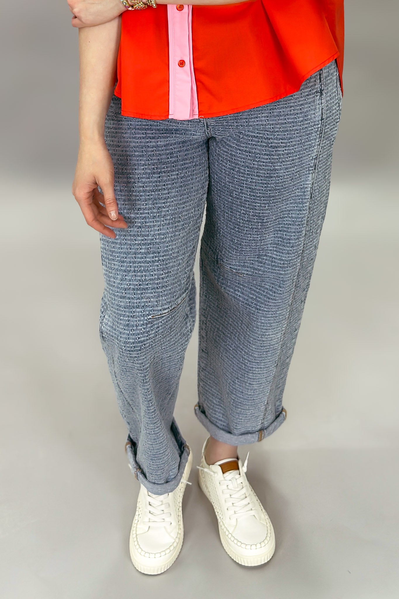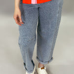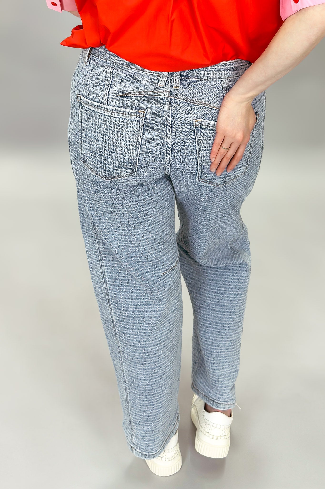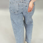 These textured denim barrel jeans bring an effortless edge to everyday denim. Designed with a relaxed slouchy silhouette, they feature a soft barrel leg that tapers slightly at the ankle for a modern, flattering shape. The subtle textured denim adds dimension and visual interest, while the cuffed hem gives them a laid-back, casual finish. With classic five-pocket styling and a comfortable mid-rise fit, these jeans are easy to style and easy to wear all season long.