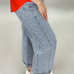 Light wash textured slouchy barrel jeans with cuffed hem and relaxed fit.