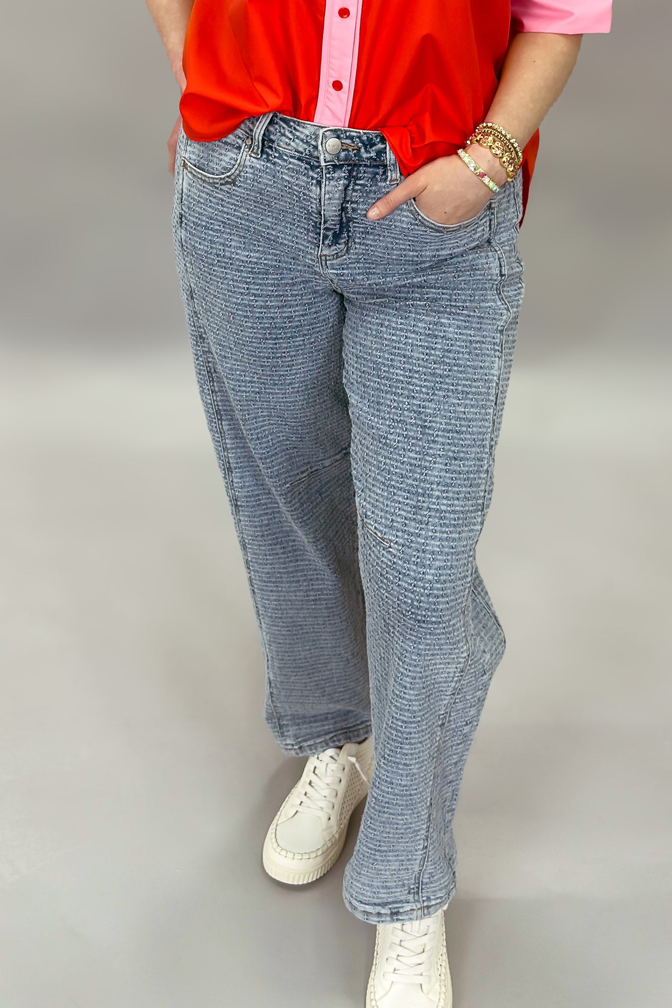• Light wash textured denim