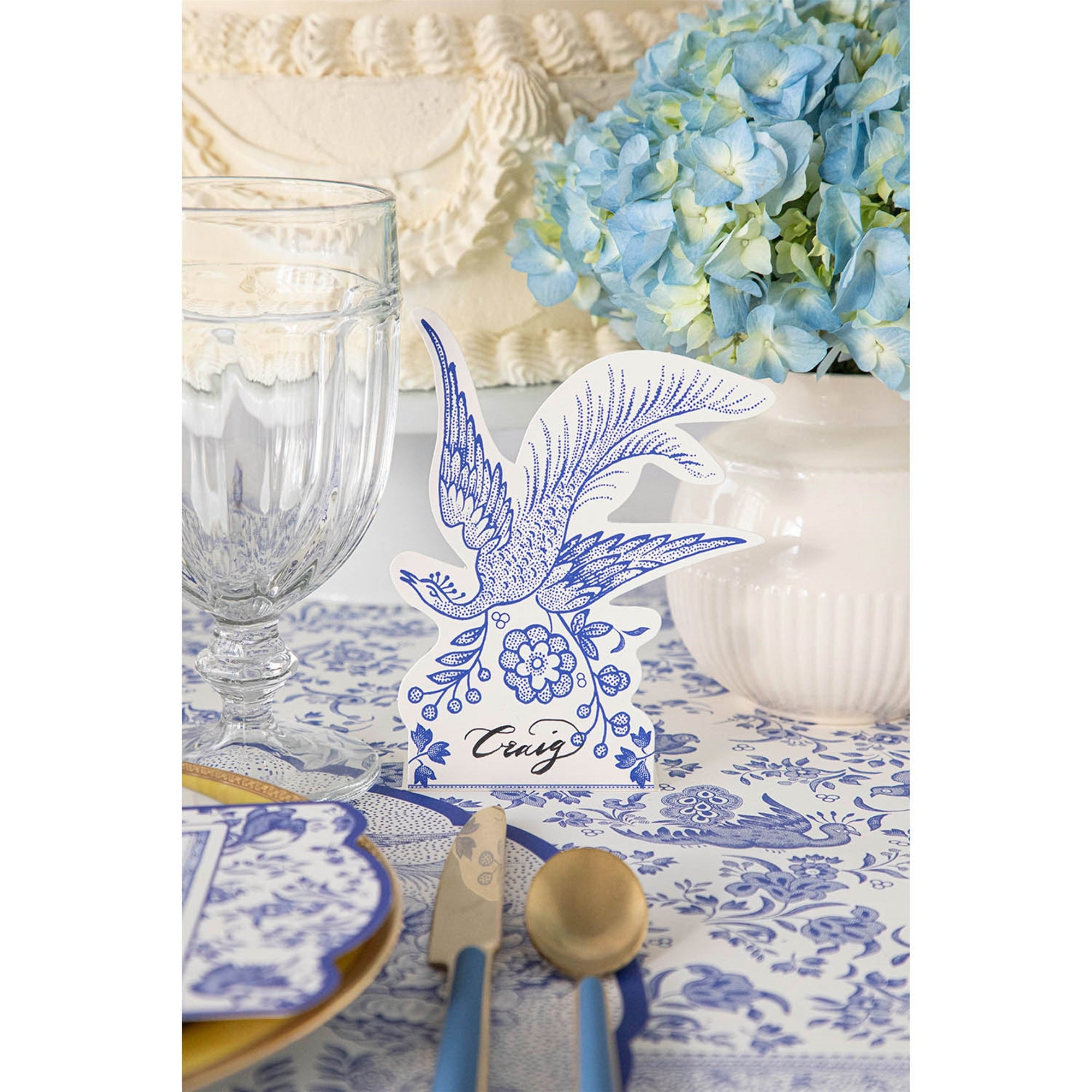 This majestic place card is a perfect pairing to the Burleigh collaboration. One of their most celebrated and beautiful designs is accented as a place card.