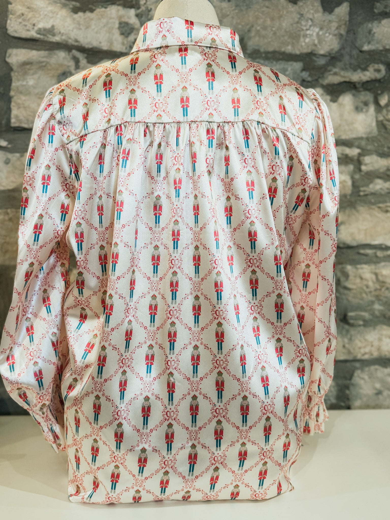 Festive and fun with a touch of luxury—this Nutcracker satin top brings holiday cheer to any look with its playful print and polished finish.
