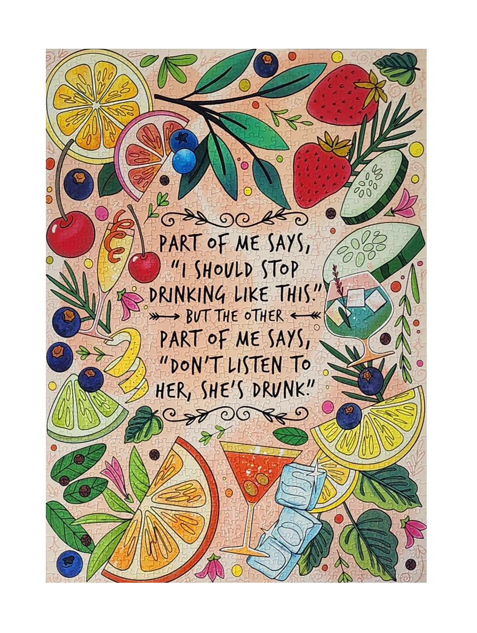 On one hand, I know I probably shouldn't drink like this, but on the other hand, she's telling me to ignore that advice. Our latest jigsaw puzzle set, 1,000 pieces strong, is made in the USA and printed on eco-friendly paper with safe inks. It even has a luscious soft touch texture! And bonus, every box comes with a poster!