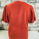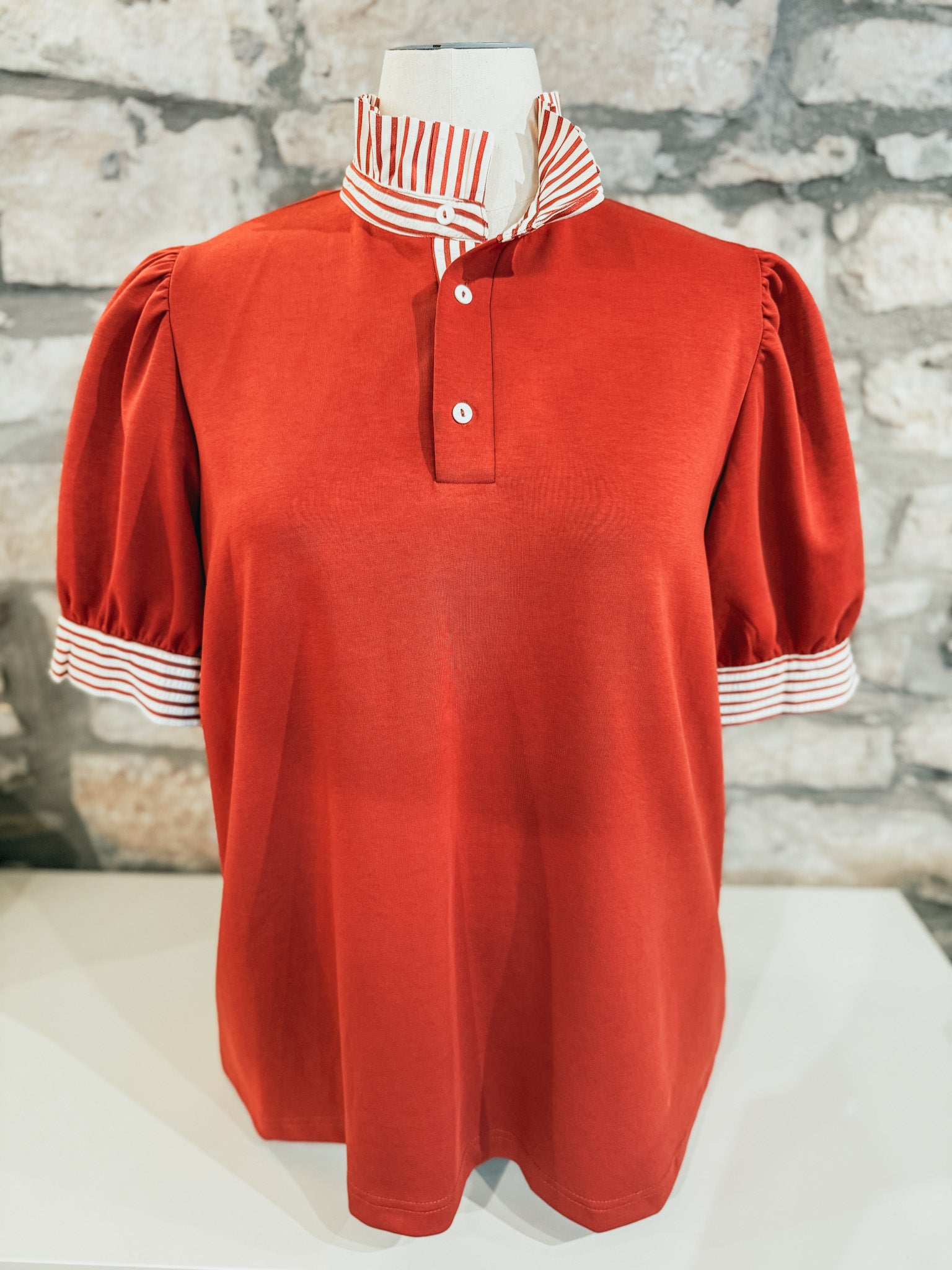 This top is where comfort meets style. Made from a soft, lightweight knit, it features puff sleeves and a playful contrast striped detail on the ruffle neck and sleeve cuffs. The rich rust color makes it perfect for fall, and the pullover style keeps it easy and effortless.