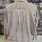 Meet your new favorite layering piece. This lightweight button-down features a classic brown-and-cream stripe in a textured seersucker fabric that’s breathable and easy to wear. The pleated drape hem in the back adds a touch of movement, giving it an effortlessly chic silhouette. Perfect for tucking, tying, or wearing loose for that relaxed, boutique look.