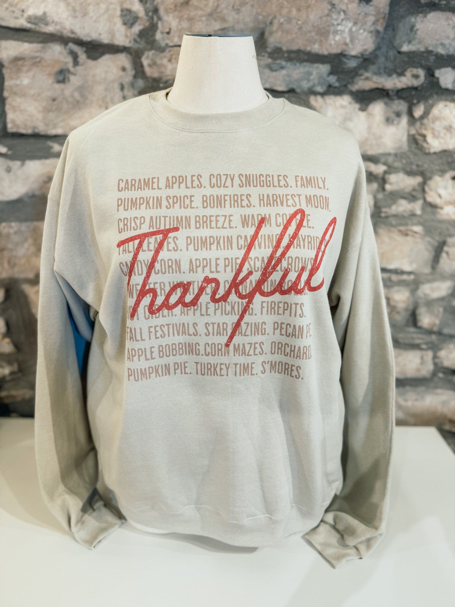 Wrap yourself in all the fall feels with this cozy crewneck! Featuring a mocha-grey background with rust-colored “Thankful” script layered over all your favorite autumn words — from pumpkin spice to bonfires — this sweatshirt is a seasonal must-have. Proudly designed and printed in Nashville, Tennessee, it’s soft, comfy, and perfect for crisp fall days.