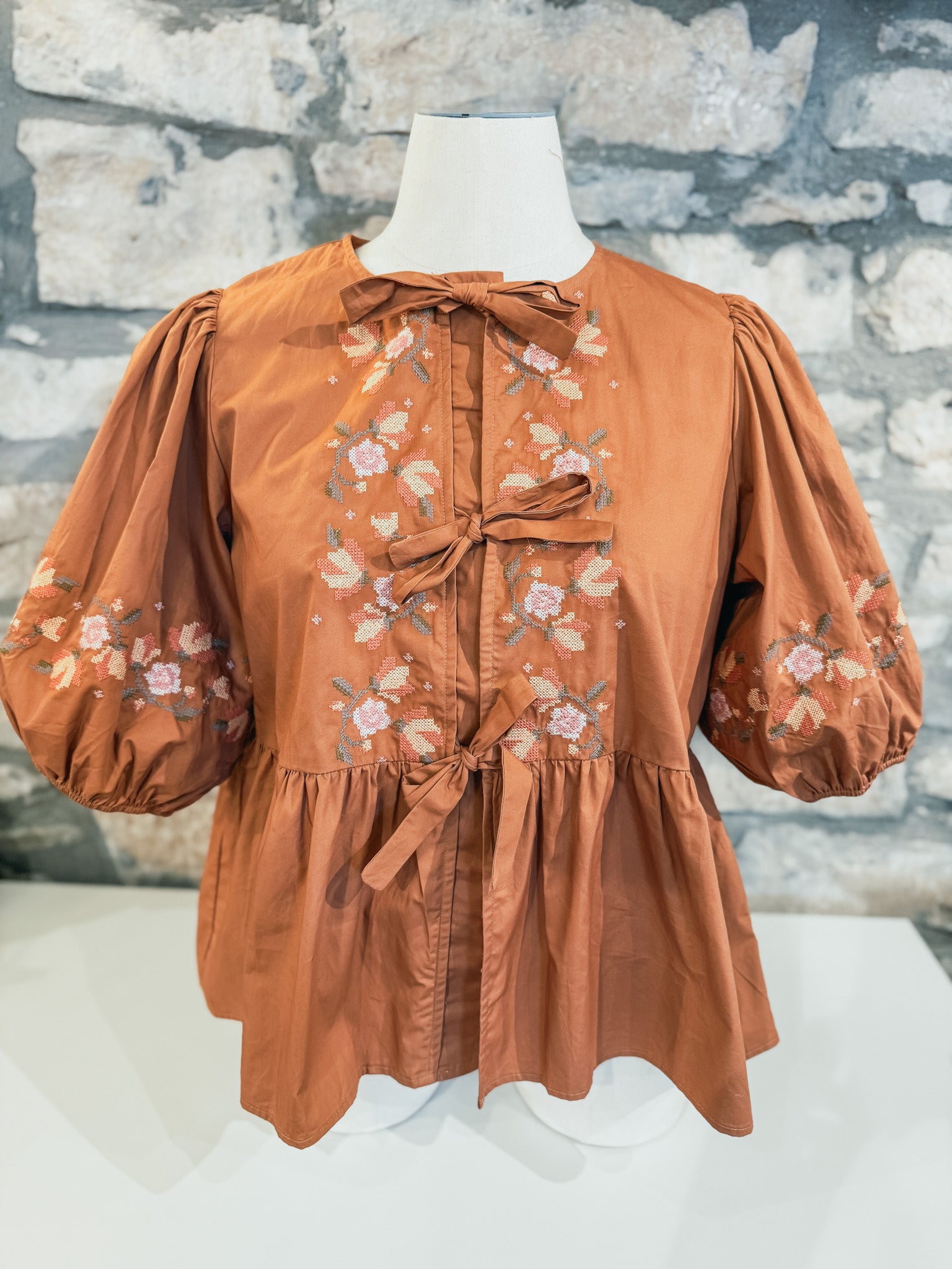 This blouse is fall perfection — rich rust cotton poplin, feminine embroidery, and a flattering peplum shape that ties at the front for just the right amount of waist definition. The puffed sleeves add volume without feeling too dramatic, and the sweet ribbon ties give it a romantic, vintage-inspired vibe. Made from 100% breathable cotton, this top is perfect for dressing up with trousers or going casual with denim.