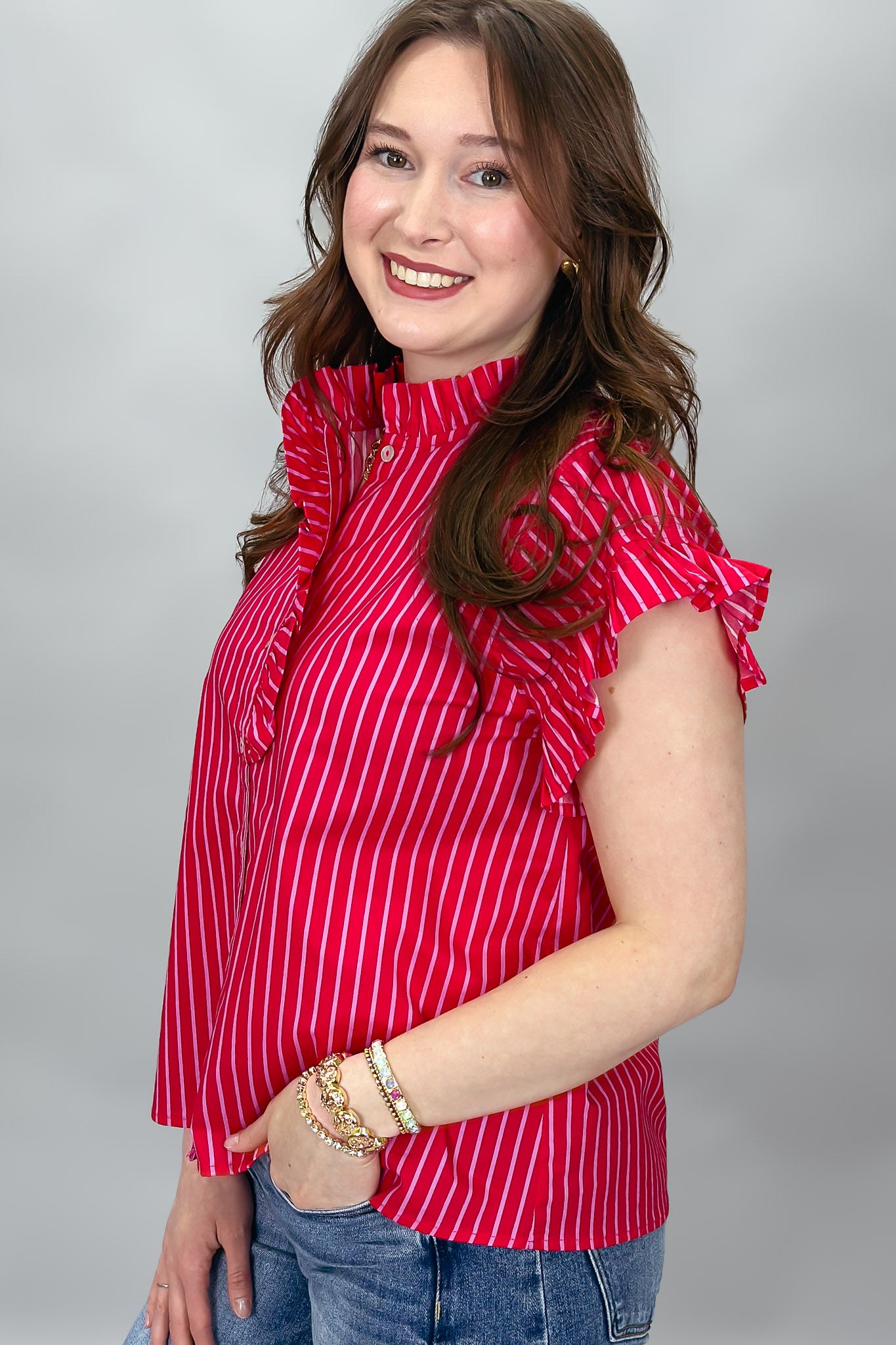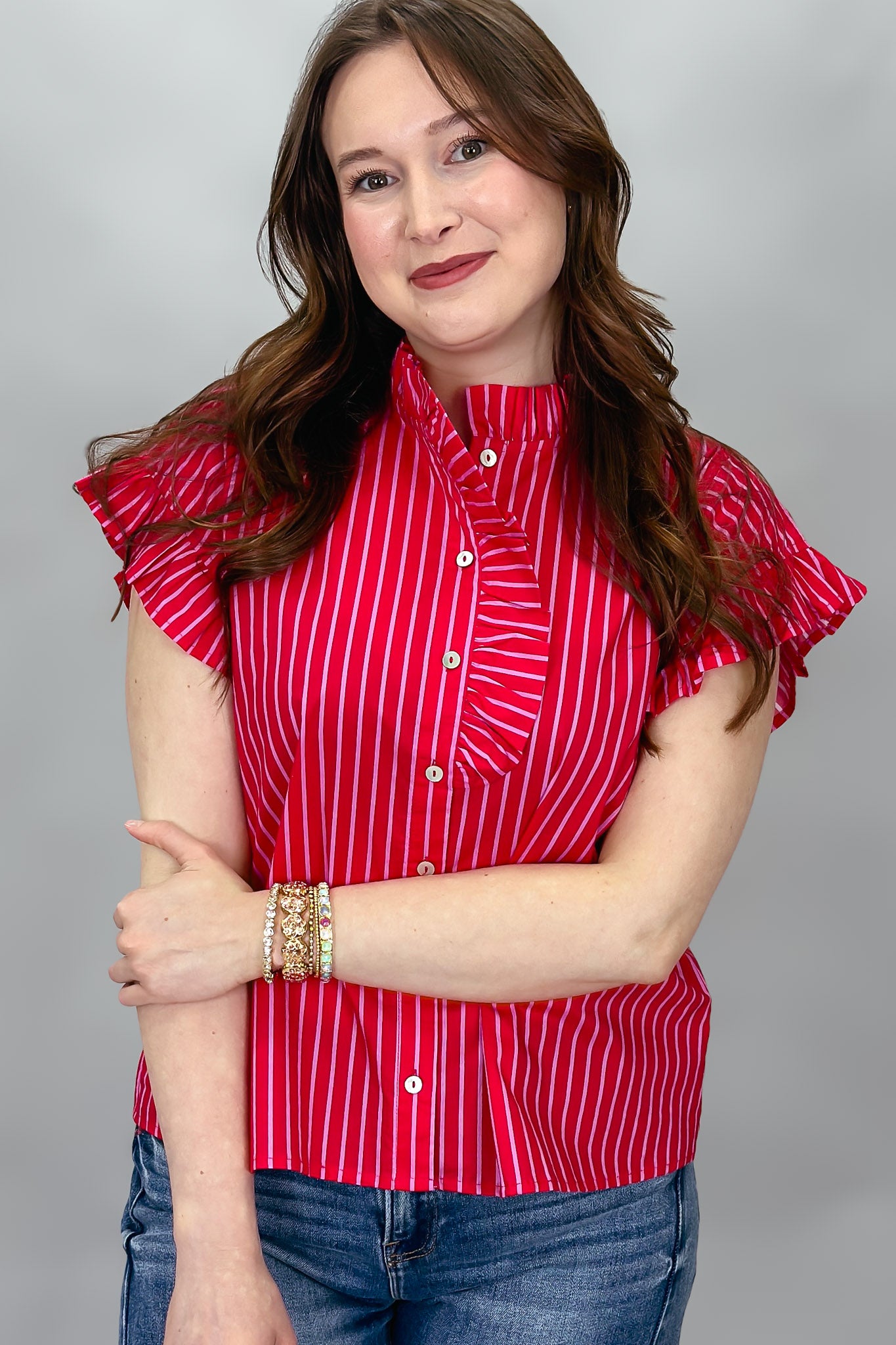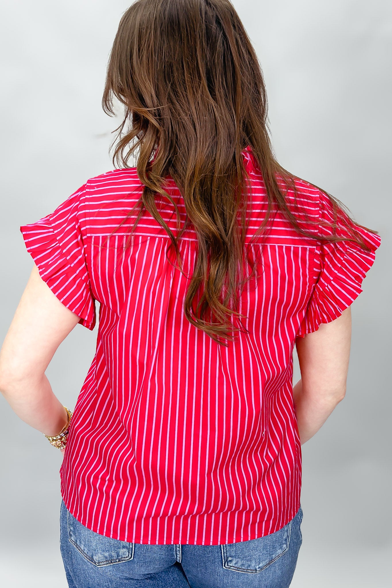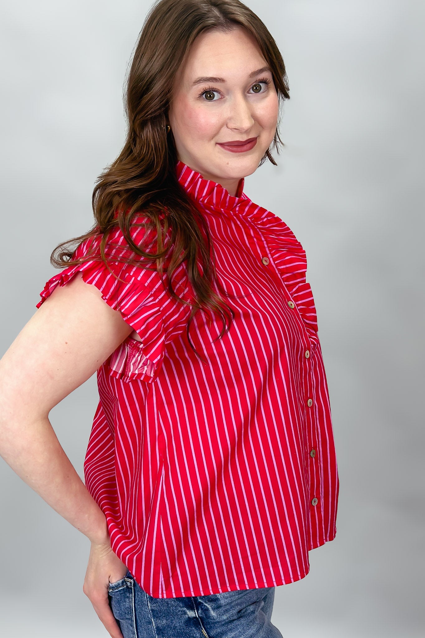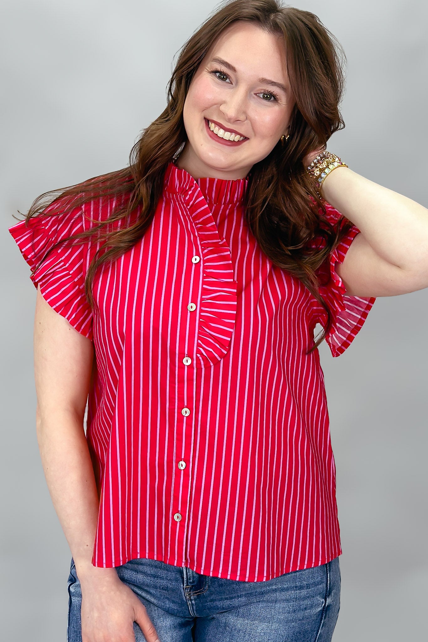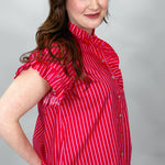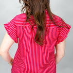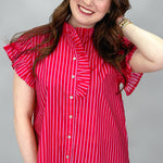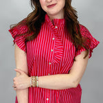 Red striped ruffle sleeve blouse with button front.